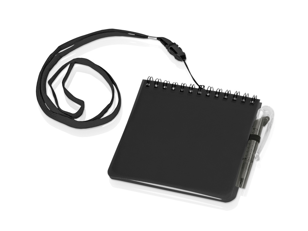 Яркий блокнот с шариковой ручкой можно носить на шее благодаря специальному ремешку (45 см). Отличный промо-сувенир, на обложку которого можно нанести логотип.