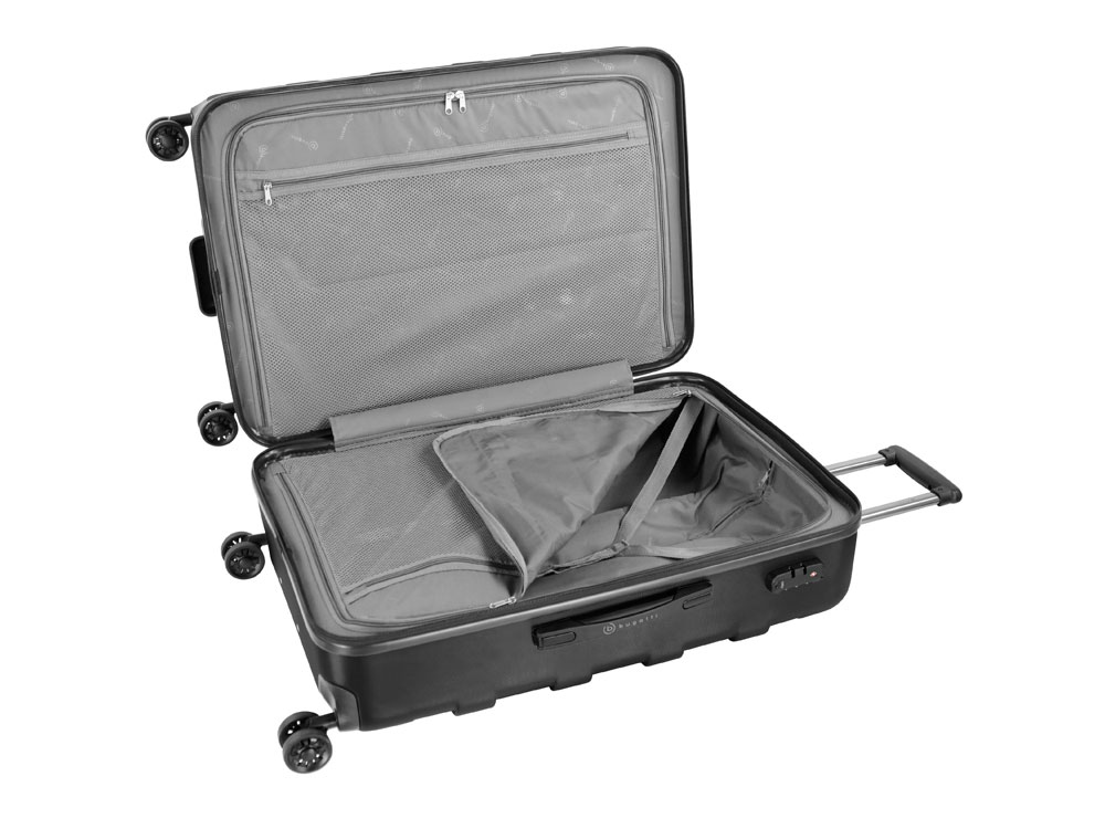 ЧЕМОДАН GALATEA Galatea - наша неповторимая серия чемоданов с рельефно нанесённым на корпус большим логотипом Bugatti. Вся товарная линейка представлена в классическом чёрном цвете. Благодаря корпусу, сделанному из смеси АБС-пластика и поликарбоната, каждая модель отличается лёгким весом и повышенной прочностью. Четыре резиновых колеса с бесшумным ходом и возможностью поворота на 360° обеспечивают ровное движение. Лёгкая телескопическая ручка эргономичной формы фиксируется в нескольких положениях для удобства пользователей с разным ростом. Замок TSA с трехзначным кодом идеально подходит для защиты содержимого багажа от несанкционированного вскрытия. Дополнительная ручка на дне корпуса облегчает загрузку и выгрузку чемодана. Сетчатые разделительные стенки на молнии растягиваются для удобства упаковки, а фиксирующие ремни охватывают большую поверхность и обеспечивают сохранность сложенных вещей. СВОЙСТВА Внутренняя организация: основное отделение на молнии с 2 отсеками, 2 сетчатыми перегородками на молнии и фиксирующими ремнями Внешняя организация: телескопическая ручка, кодовый замок TSA, 4 двойных колеса, боковая ручка, ручка на дне Размер: 53 x 30,5 x 77 см Объём: 96 л Вес: 4,26 кг Материал: поликарбонат / АБС-пластик