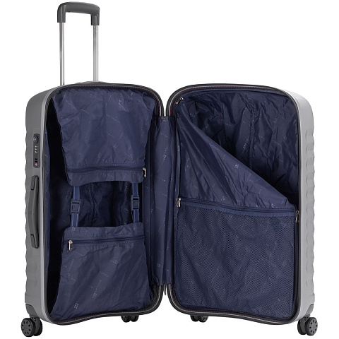 • Чемодан с 2 отделениями: одно из них с прижимом для одежды и дополнительными карманами, второе — с разделителем на молнии и сетчатым карманом