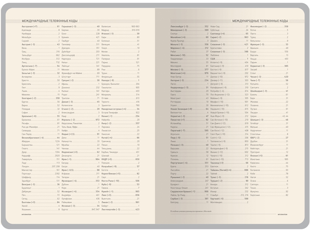 Недатированный ежедневник Megapolis Flex Nebraska формата А5 - идеальный помощник в деле планирования рабочего времени для тех, кто ценит рационализм и функциональность. Гибкая (flex) обложка из искусственной кожи с благородной глянцевой поверхностью и практичный книжный переплет надежно предохраняют блок от механических повреждений. Золотой обрез, закругленные углы блока и обложки - верх утилитарности и одновременно икона стиля. Ничего лишнего, ни одной необоснованной детали, и при этом сколько элегантности! Внутренний блок выполнен из бежевой бумаги плотностью 70 г/кв.м и имеет разделы: • для планирования с линовкой и указанием времени с интервалом в один час; • страница для персональных данных; • справочная информация на 19 страницах (аэропорты Европы, штрихкоды, международные телефонные коды, цифровые автомобильные коды, энергетическая и питательная ценность продуктов, национальные и религиозные праздники, единицы измерения, страны мира, размеры одежды, форматы бумаги и др.); • телефонная книга на 19 страницах.