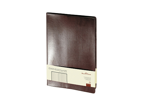 Строгий еженедельник портфолио выпускается в кожаной съемной обложке. По периметру обложки подходит строчка нитками в тон обложке. Металлизированный обрез блока окрашен под золото. Недатированный еженедельник формата А4 удобен для настольного использования. Блок для записей состоит из 128 страниц бежевой бумаги с плотностью 70 грамм. На 19 страницах размещен справочно-информационный блок с актуальными сведениями. Для размещения ручки предусмотрена кожаная петля.