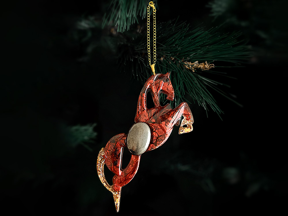 Лошадь - олицетворение свободы, силы и стремления вперёд. Фигура выполнена в динамике — будто застыла в прыжке, передавая энергию движения и благородства. Создана из ювелирной эпоксидной смолы и украшена природным камнем. Игрушка бережно упакована в картонную коробку с внутренним вкладышем, который надежно фиксирует её внутри. Для вашего удобства к игрушке прилагается цепочка или ленточка, с помощью которой вы легко сможете подвесить её на ёлку.