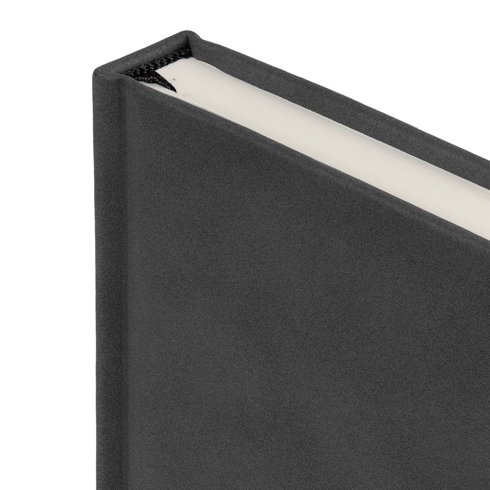 Ежедневник с твердой обложкой c поролоном, выполнен из материала Nubuck, темно-серый ЕЕ, дополнен капталом и ляссе черного цвета. Застежка — магнитный хлястик.