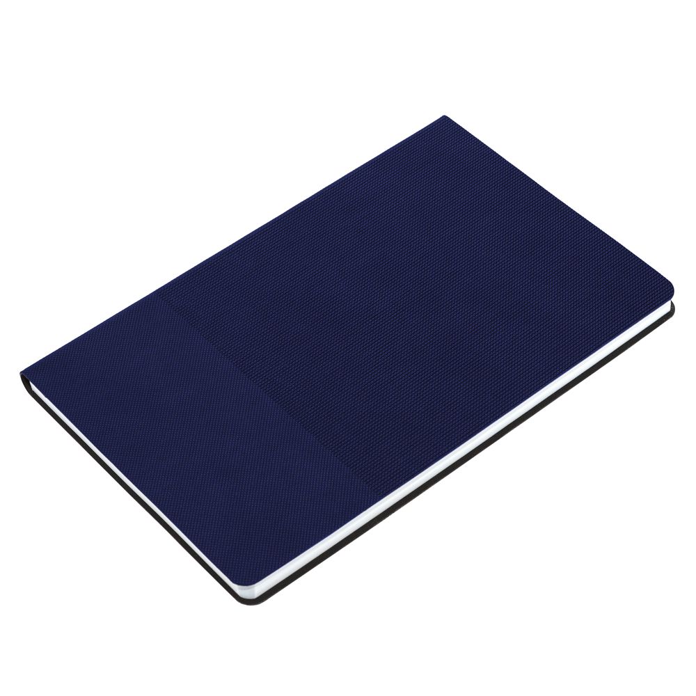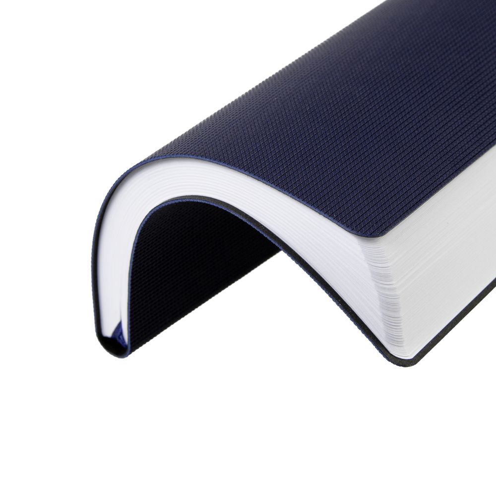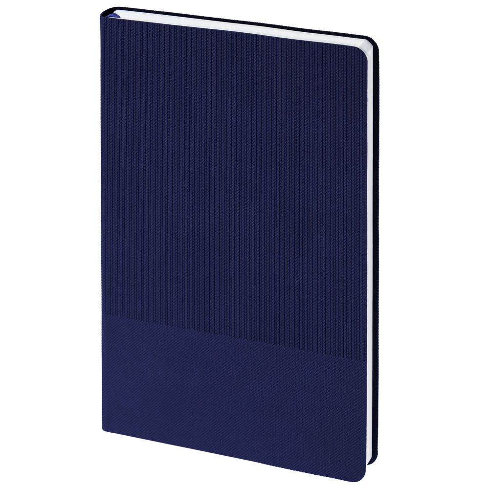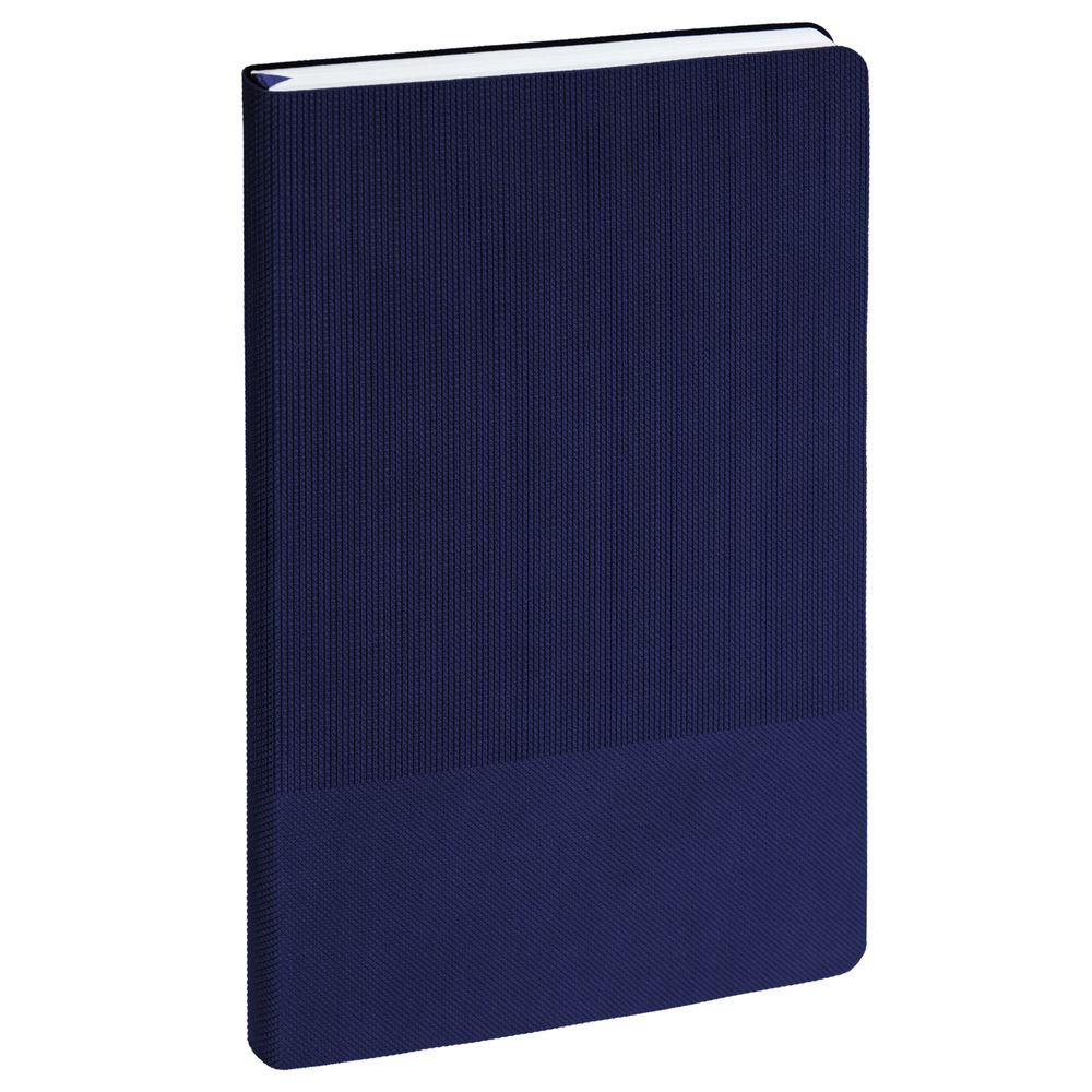 Ежедневник с гибкой обложкой, выполнен из материала Canyon, темно-синий ХХ, дополнен ляссе в цвет обложки. Блинтовое тиснение на обложке создает эффект вязаного полотна.