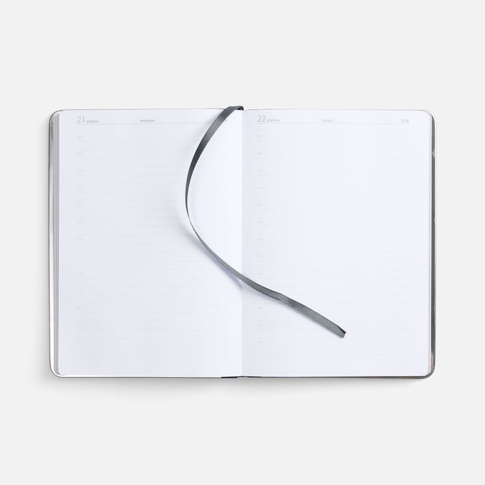Ежедневник с твердой обложкой и серебристым  обрезом блока. Выполнен из материала Nubuck, серый СС, дополнен серым ляссе и металлическими рамками с двух сторон обложки.