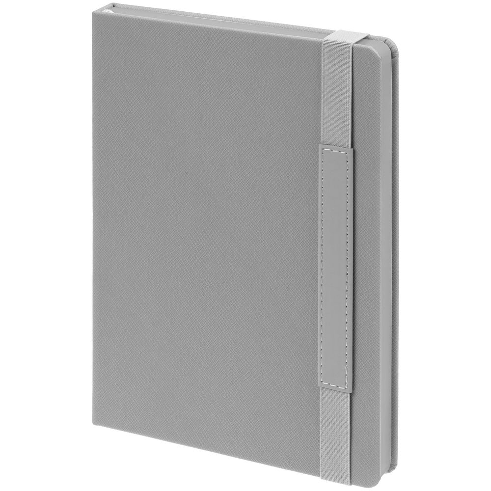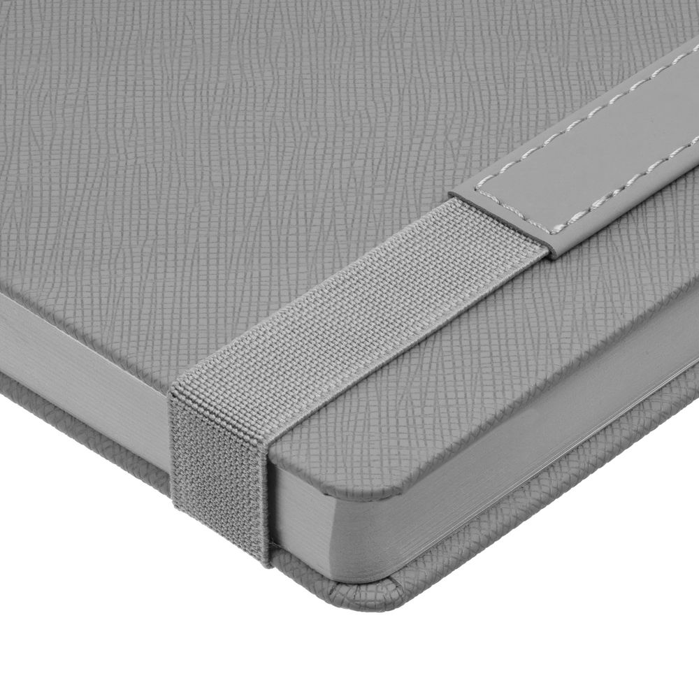 Ежедневник с твердой обложкой, выполнен из материала Nice Touch, серый СС, дополнен резинкой с шильдой из материала Soft Touch и ляссе в цвет обложки.