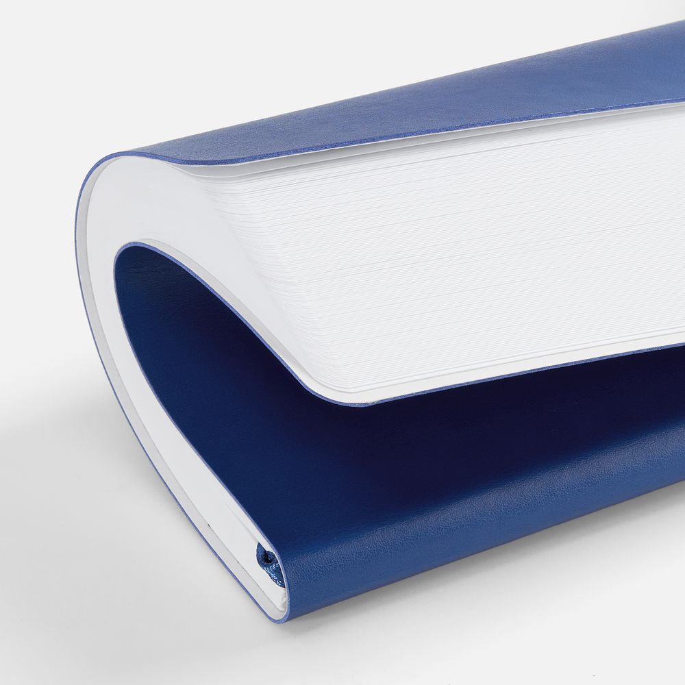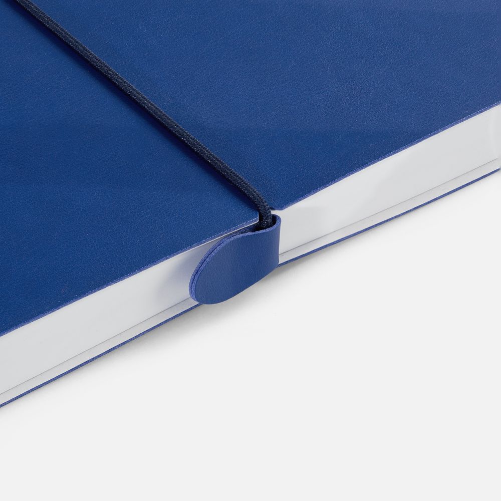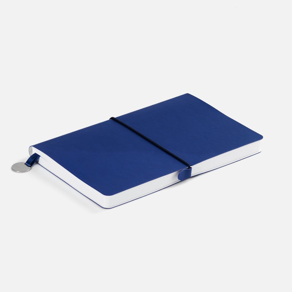 Ежедневник с гибкой обложкой, выполнен из материала Waltz, синий НН, дополнен ляссе в цвет обложки с металлическим шильдом.