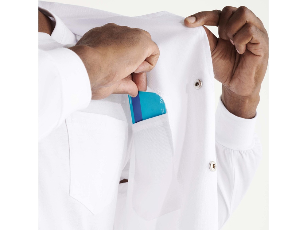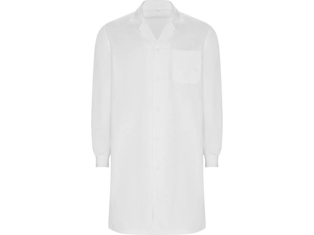 Халат унисекс с длинным рукавом · Рибовые манжеты · Центральная застежка на скрытые кнопки · Внутренний карман на груди слева