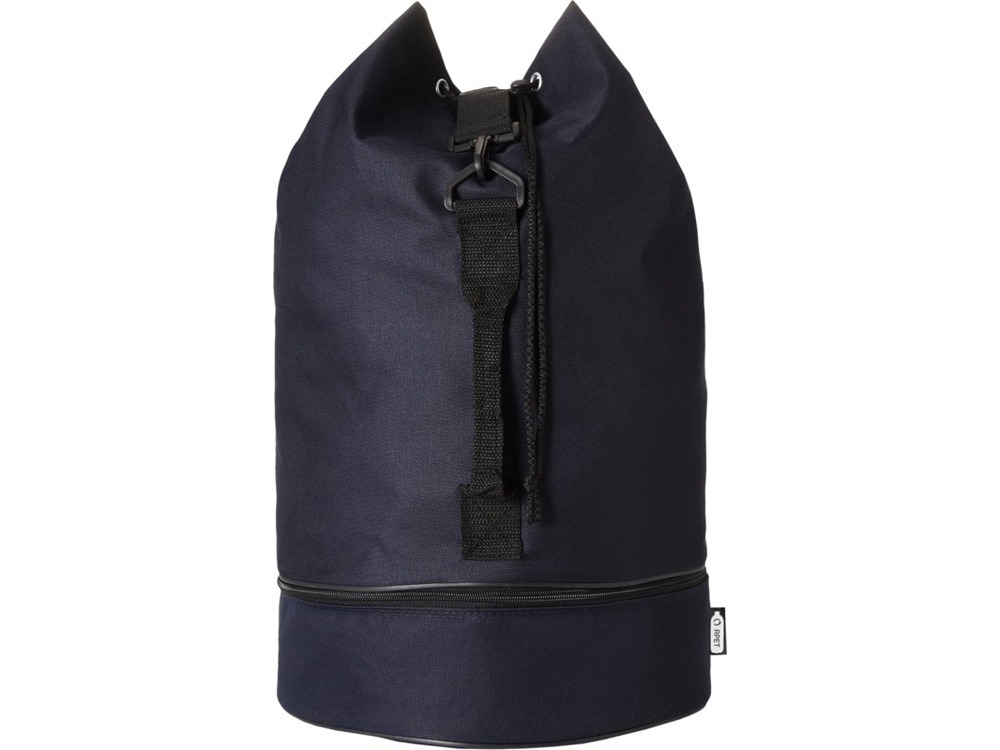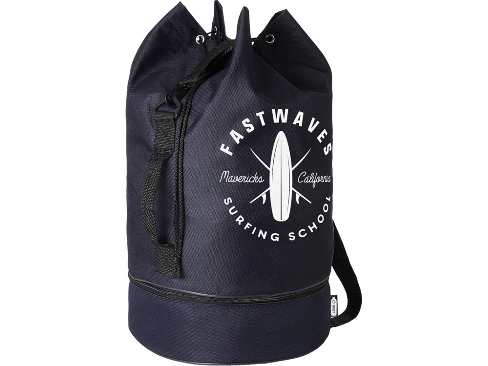 Водонепроницаемый спортивный вещмешок из переработанного РЕТ-пластика с вместительным 20 основным отделением объемом 20 литров, застежкой на шнурке, боковой ручкой и регулируемым плечевым ремнем. Также имеет отдельное нижнее отделение на молнии для небольших предметов.