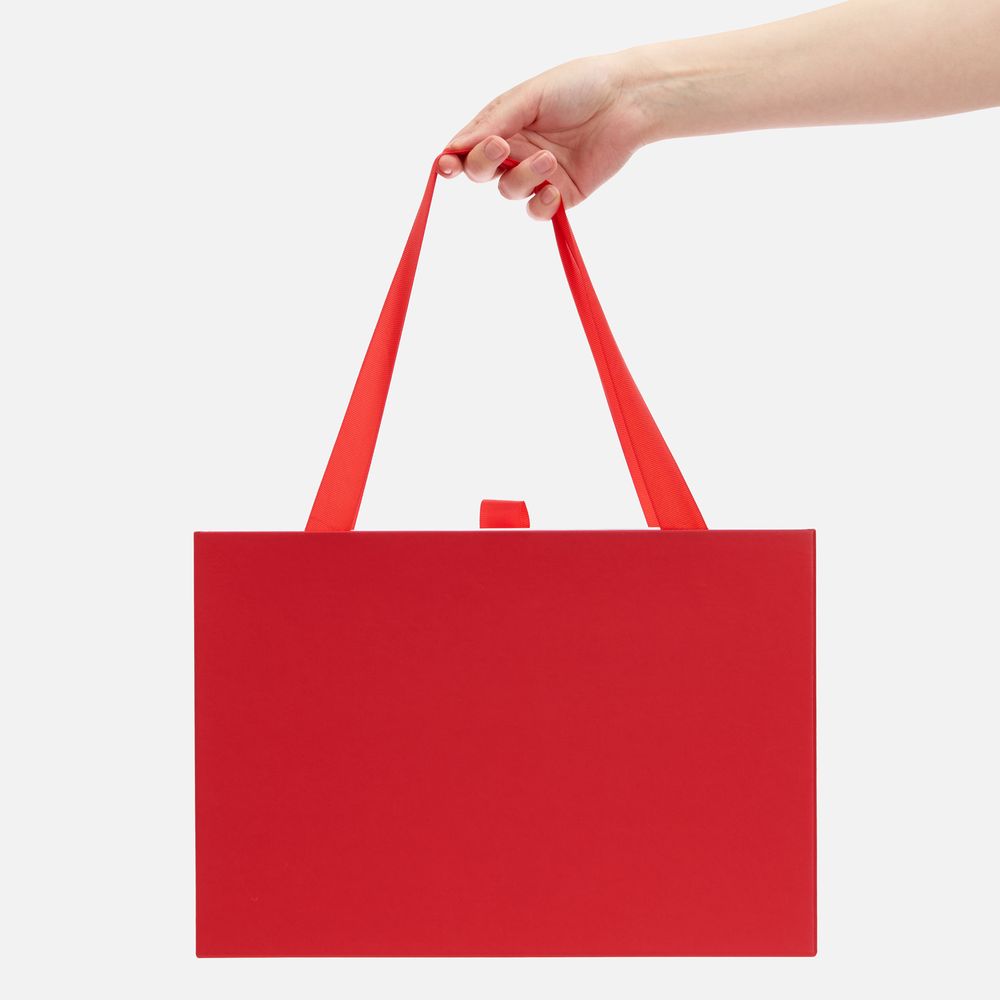 Внешний короб каширован дизайнерской бумаги и оснащен прочными ручками из репсовой ленты. Внутренний короб отделан белой бумагой, ламинированной матовой пленкой.