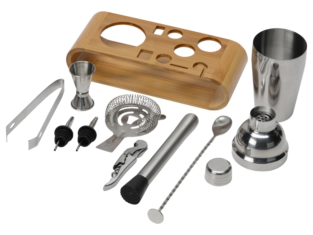 Комплектность бамбуковая подставка- 27,3 х 10,6 х 6,6 см, барная ложка, джиггер 15/30 мл, гейзер -2 шт, мадлер, штопор, стрейнер, щипцы для льда, шейкер 550 мл