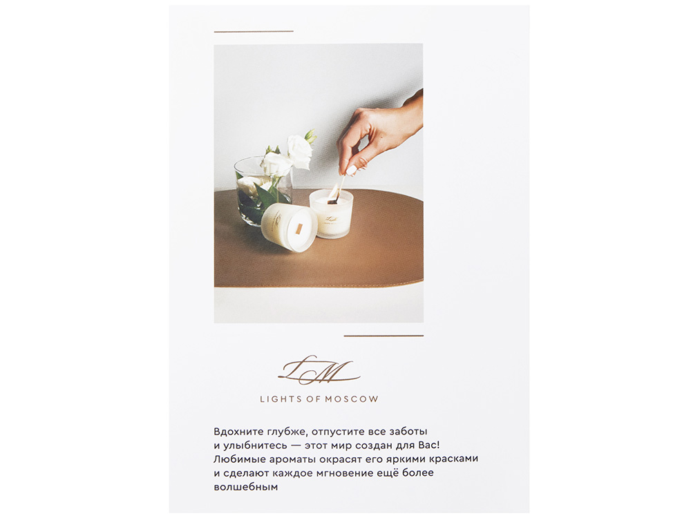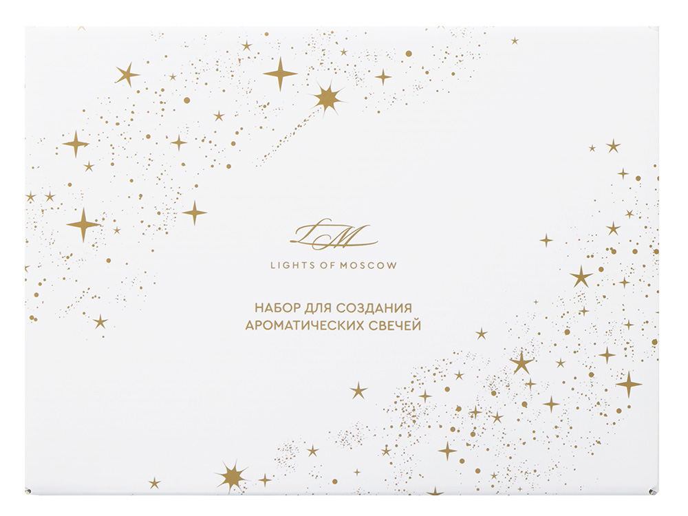 Уникальный набор для изготовления ароматических свечей станет приятным подарком и погрузит в увлекательный процесс. Набор выполнен в подарочной коробке с ложементом, в него входят все необходимые компоненты и подробная инструкция. Откройте для себя удивительный мир ароматов с Lights of Moscow! Вы сможете создать две невероятные композиции, которые точно понравятся Вам и Вашим близким! Условия хранения: — Свечи: +18…+24 °C, вдали от источников тепла, сквозняков и прямых солнечных лучей. — Рекомендуемая влажность — не более 50%. — Избегайте длительного воздействия яркого света. В комплекте: Подарочная брендированная коробка с ложементом - 1 шт. Стакан стеклянный матовый с тиснением логотипа LM 100 мл - 2 шт. Контейнер с соевым воском – 2 шт. Флакон стеклянный матовый c тиснением логотипа LM с ароматической отдушкой – 2 шт. Деревянный фитиль с держателем – 1 шт. Хлопковый фитиль с держателем - 1 шт. Наклейка для крепления фитиля - 2 шт. Палочка для перемешивания - 2 шт. Салфетка - 1 шт. Перчатка - 1 шт. Открытка - 1 шт. Инструкция по изготовлению ароматических свечей – 1 шт.