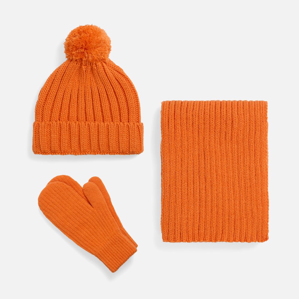 Шапка с пышным помпоном и отворотом, связанная крупной резинкой создает игривый силуэт, а широкий шарф с выразительной текстурой надежно защищает от ветра, сохраняя свободу движений. Варежки с отворотом-резинкой плотно облегают запястье, не пропуская холод.