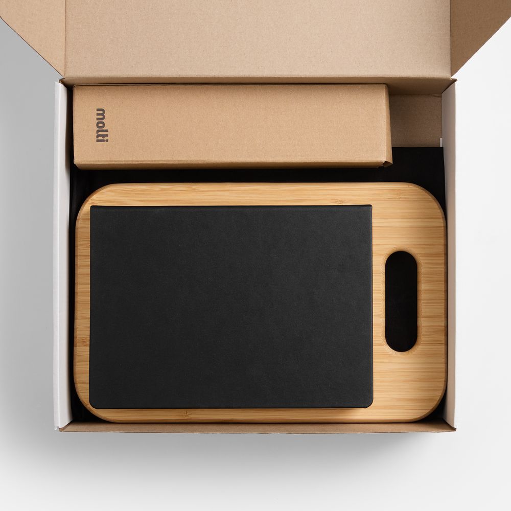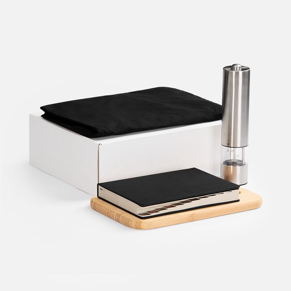 | Материал | мельница - нержавеющая сталь; пластик; фартук - хлопок 100%, плотность 240 г/м²; ежедневник - покрытие софт-тач; доска - бамбук; коробка - микрогофрокартон, Т-23Е |