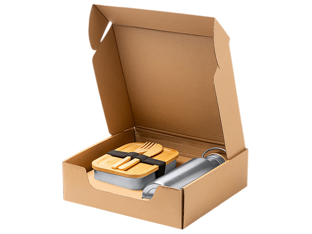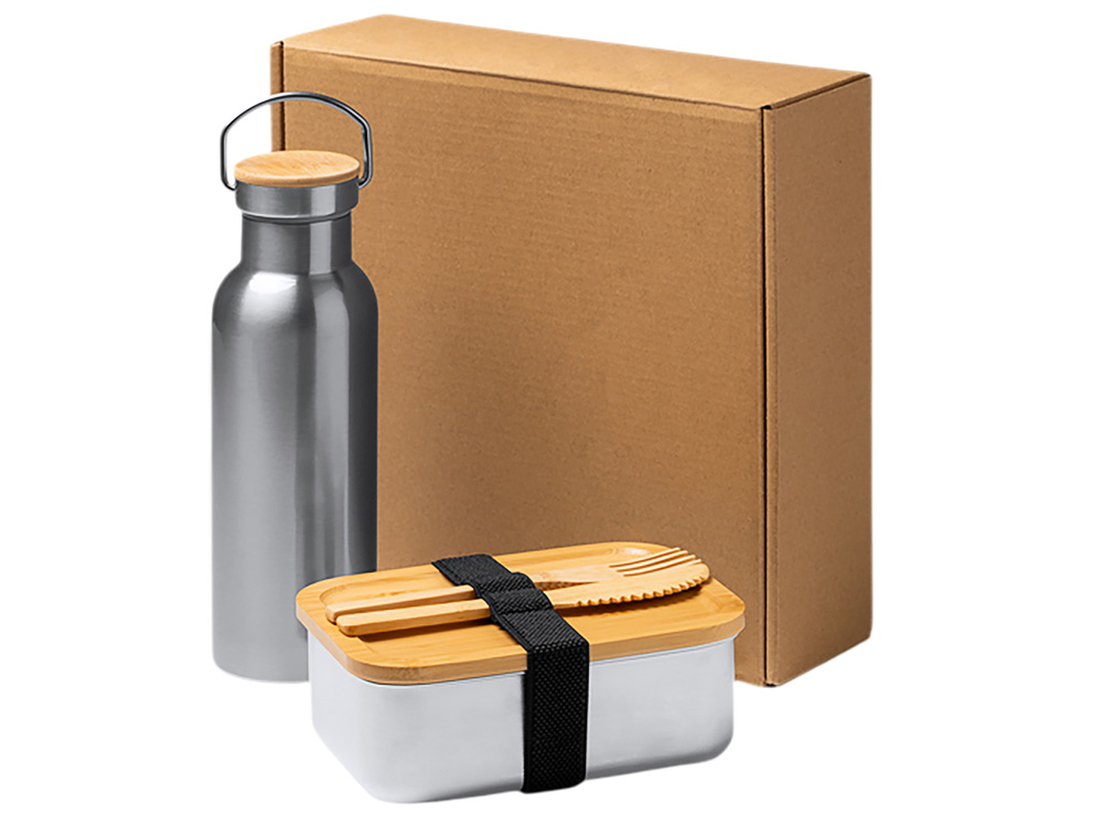 Полноценный обеденный набор из экологичных материалов. Подходит для офиса, учебы, путешествий или пикника. Поставляется в стильной экологичной коробке — отличный вариант для подарка. В комплекте: 1. Ланч-бокс (800 мл) - Материал: нержавеющая сталь 304 + крышка из натурального бамбука - Крышка фиксируется эластичной резинкой - Размеры: 16,2 × 12,3 × 5,7 см 2. Бутылка (500 мл) - Материал: нержавеющая сталь 304 - Размеры: высота 22 см, диаметр 7 см 3. Столовые приборы - Бамбуковые: вилка и нож Уход: рекомендуется ручная мойка (допускается мытье в посудомоечной машине, но ручная мойка продлевает срок службы бамбуковых элементов).