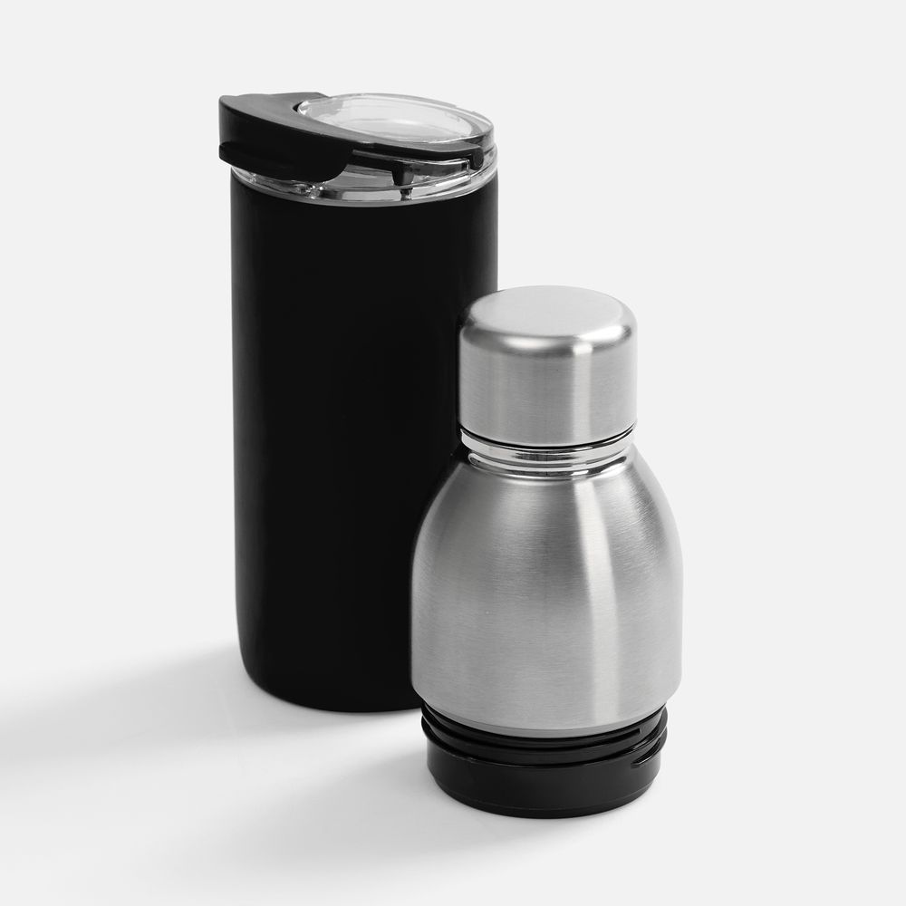 Varianti — это яркий пример посуды с двойной функциональностью. Один и тот же корпус можно превратить как в термостакан для чая и кофе с пластиковой крышкой, так и в термобутылку для прохладительных напитков со стальной крышкой.