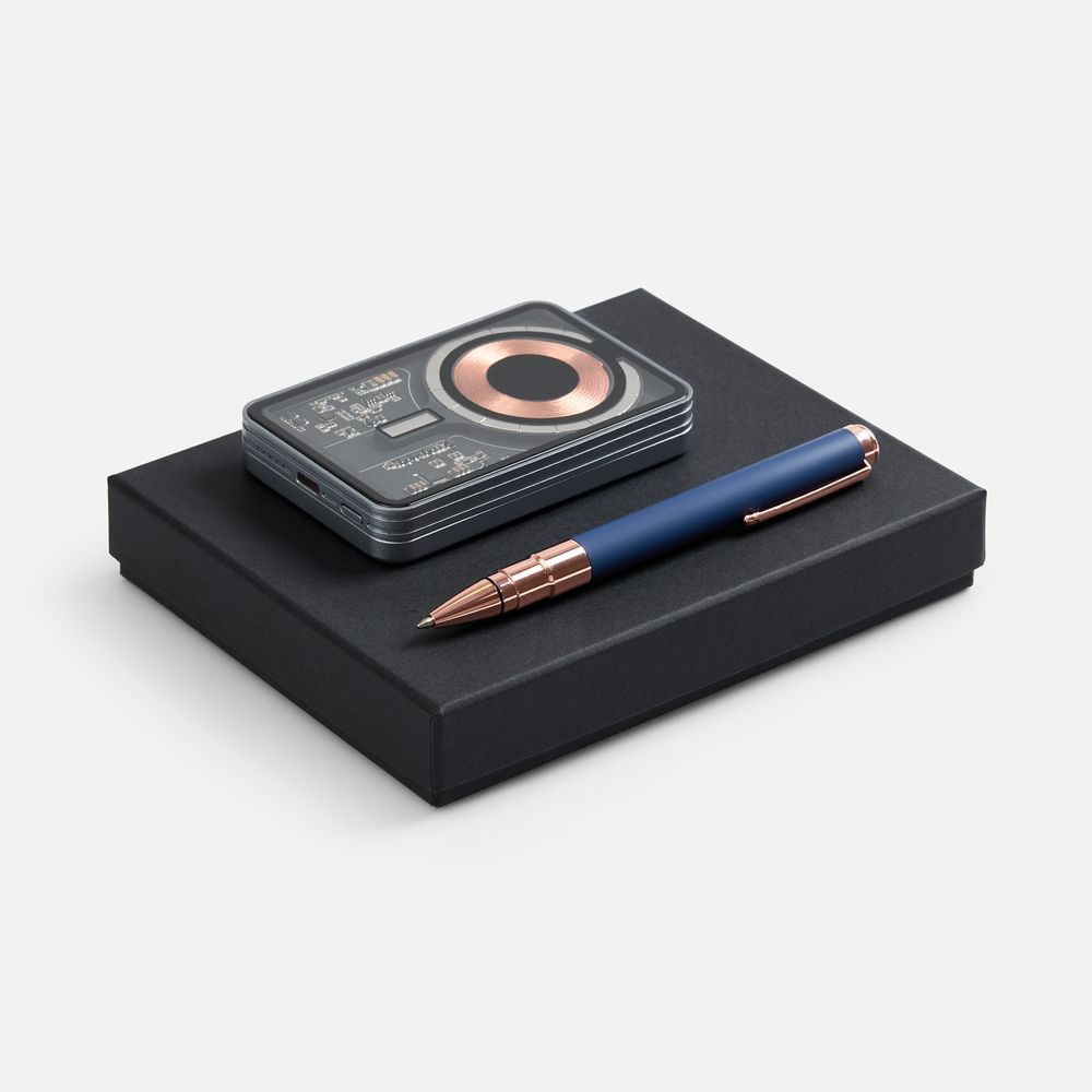 Компактный аккумулятор Cooper Ergo с премиальным корпусом и привлекательной электронной «начинкой» под прозрачной панелью в сочетании с увесистой шариковой ручкой Kugel Rosegold станут идеальным подарком как для коллег, так и для руководителей.