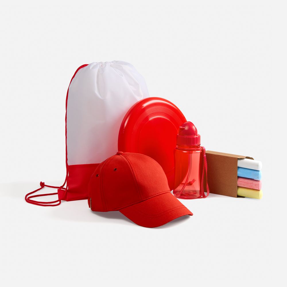 | Материал | картон; бутылка, тарелка - пластик; бейсболка - хлопок 100%, плотность 260 г/м²; рюкзак - полиэстер 100%, 210D |