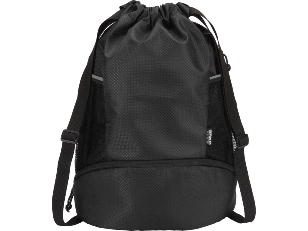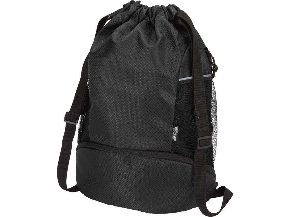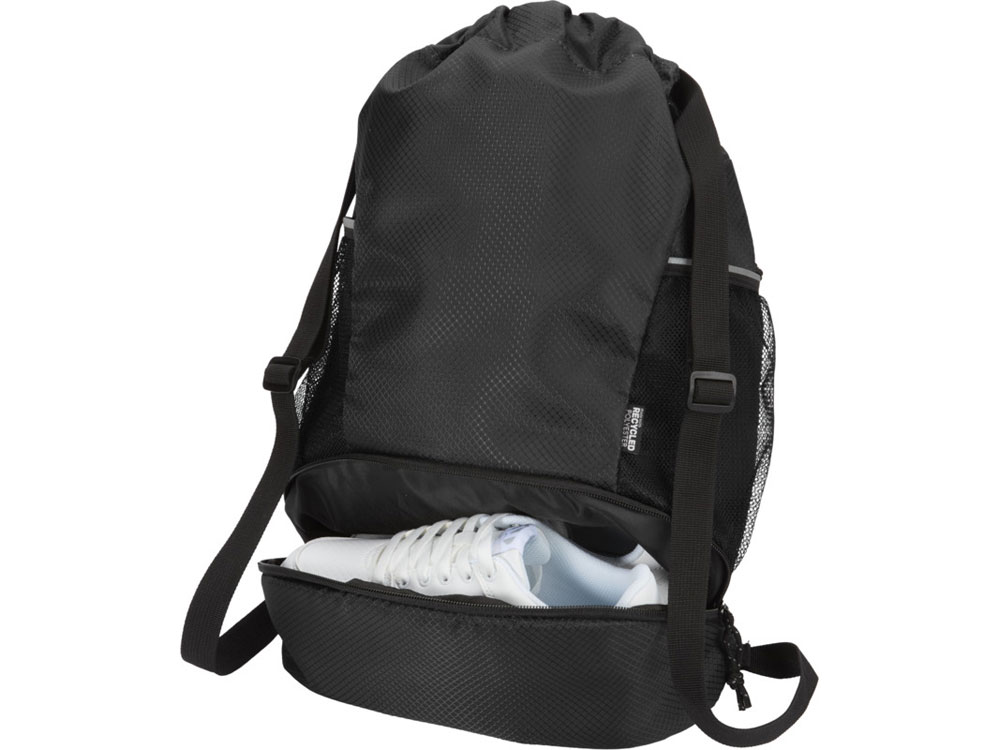 Спортивный рюкзак Доман изготовлен из переработанной ткани рипстоп, сертифицированной согласно GRS, с водоотталкивающей отделкой, подкладкой из материала RPET, сертифицированной согласно GRS, и светоотражающими элементами. Он предназначен для людей, ведущих активный образ жизни, и подходит для ежедневных занятий спортом и физических упражнений. Рюкзак имеет просторное основное отделение, в которое можно положить одежду, полотенце и даже баскетбольный мяч. Отдельное нижнее отделение позволяет хранить обувь или ношеную одежду отдельно от других вещей. Также имеет два боковых сетчатых кармана со светоотражающими деталями, один потайной карман на молнии для ценных вещей и регулируемые плечевые ремни из тесьмы для удобной переноски