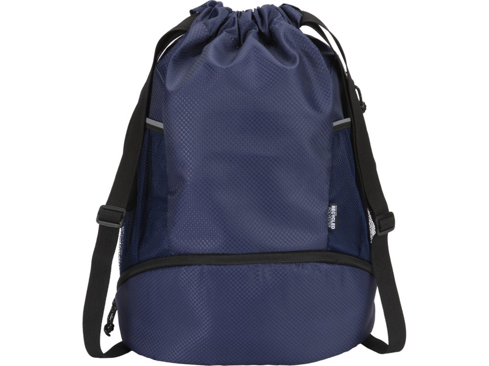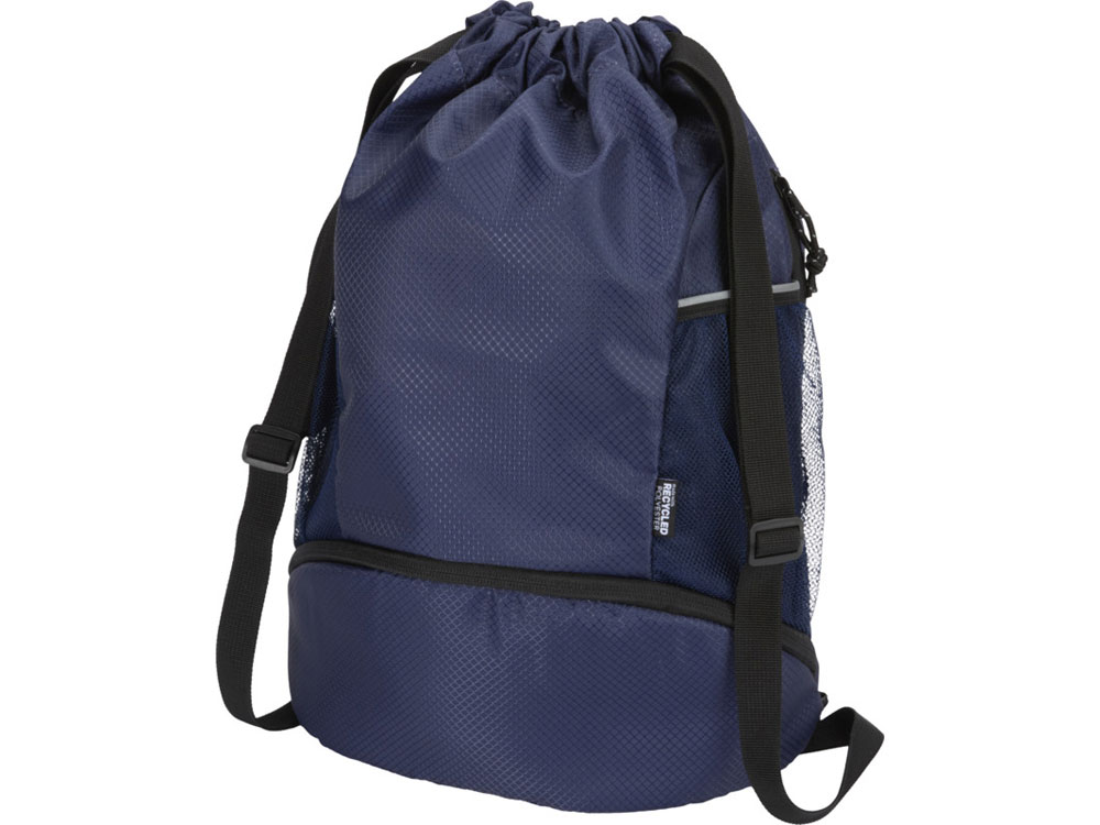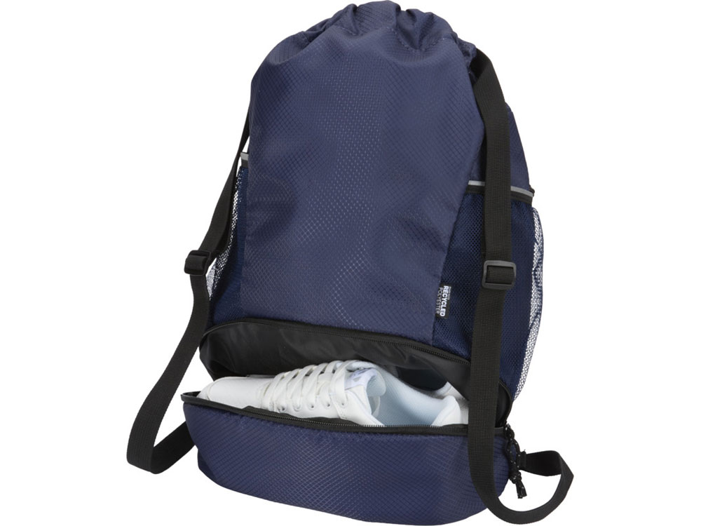 Спортивный рюкзак Доман изготовлен из переработанной ткани рипстоп, сертифицированной согласно GRS, с водоотталкивающей отделкой, подкладкой из материала RPET, сертифицированной согласно GRS, и светоотражающими элементами. Он предназначен для людей, ведущих активный образ жизни, и подходит для ежедневных занятий спортом и физических упражнений. Рюкзак имеет просторное основное отделение, в которое можно положить одежду, полотенце и даже баскетбольный мяч. Отдельное нижнее отделение позволяет хранить обувь или ношеную одежду отдельно от других вещей. Также имеет два боковых сетчатых кармана со светоотражающими деталями, один потайной карман на молнии для ценных вещей и регулируемые плечевые ремни из тесьмы для удобной переноски.