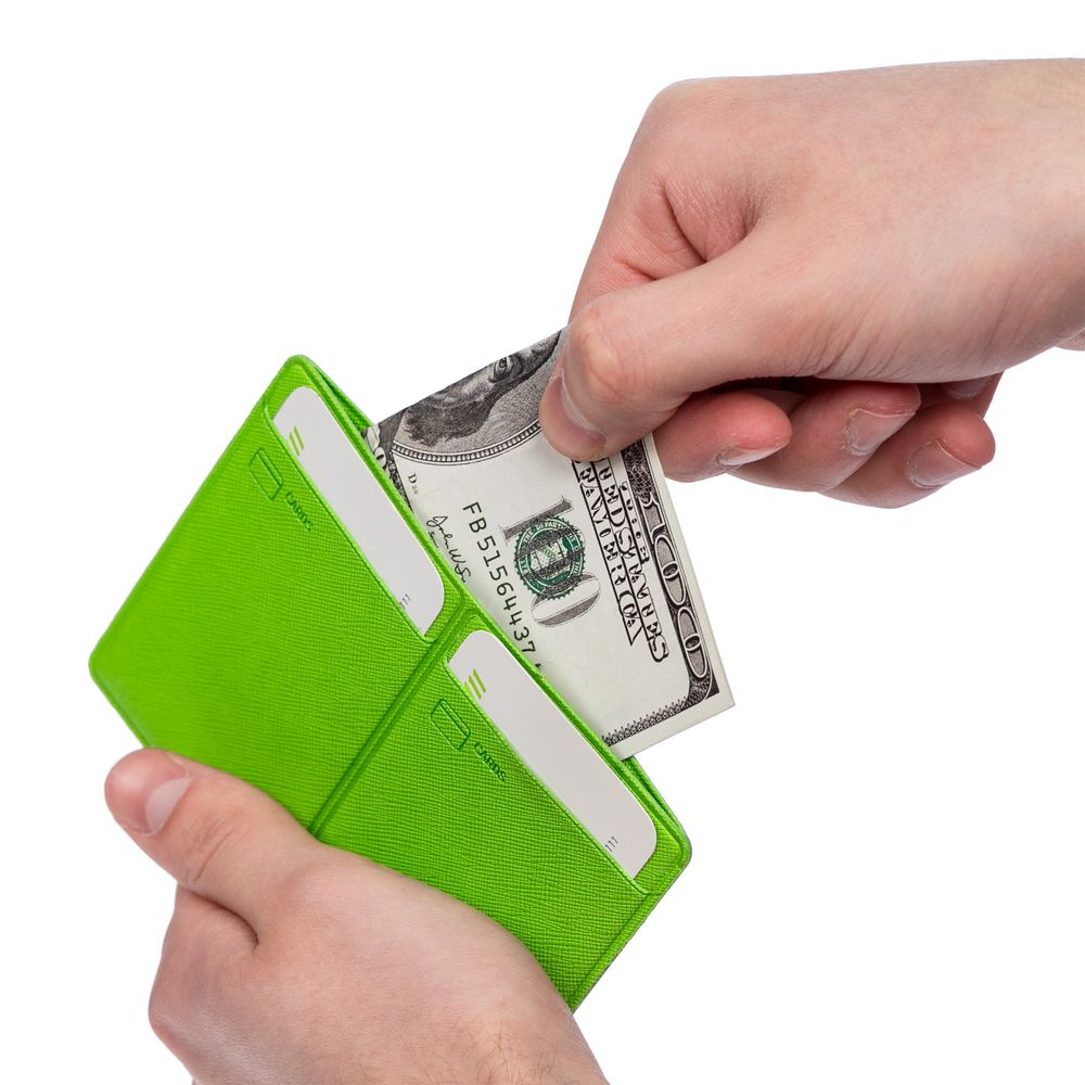 Обложка из искусственного материала, имитирующего сафьяновую кожу, с четырьмя карманами: для водительского удостоверения, свидетельства о регистрации, денег и пластиковых карт.