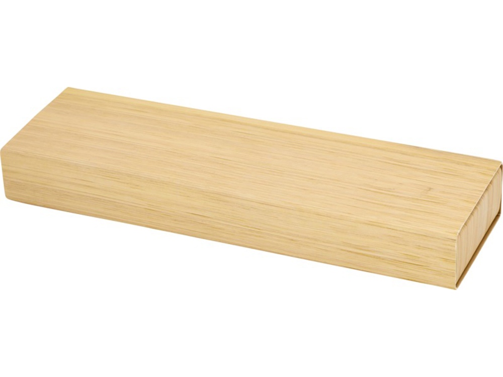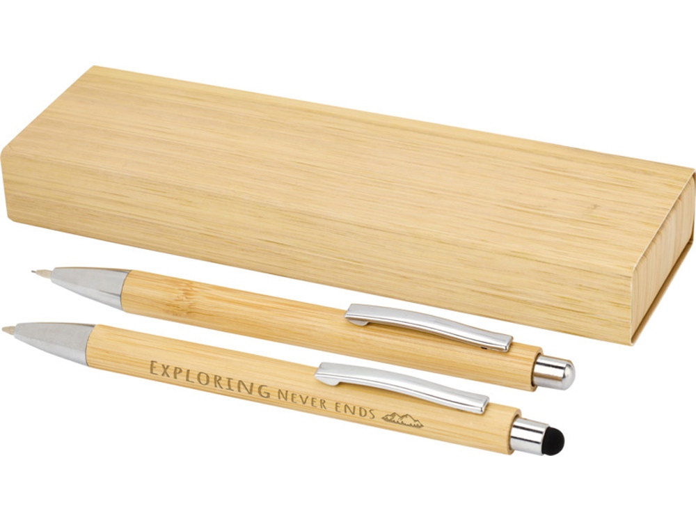 Набор Oblys состоит из шариковой ручки и механического карандаша, корпуса которых изготовлены из бамбука. Шариковая ручка имеет черный стилус и хромированный металлический зажим. Цвет чернил: черный. Размер пера: 1,00 мм. Длина непрерывной линии: 600 метров. Механический карандаш также имеет хромированный металлический зажим. Размер пера: 0,5 мм.