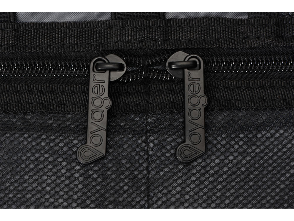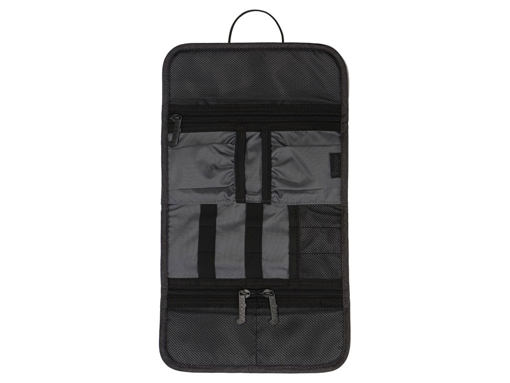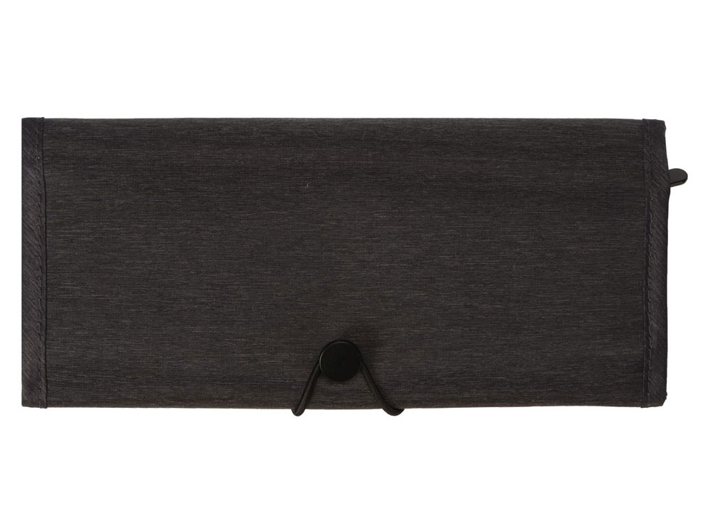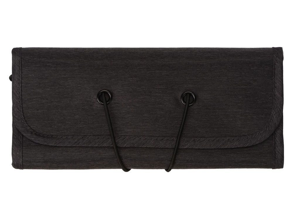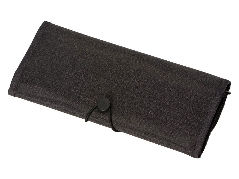 Органайзер District для электроники Voyager с множеством кармашков и отделений позволяет рассортировать девайсы, провода и другие аксессуары для техники удобным вам способом. Органайзер имеет 6 сетчатых кармашков, из них три на молнии, с бегунками, украшенными логотипом бренда. Кроме того, он имеет держатели для проводов и открытые карманы на резинке. Обложка закрывается на резинку, которая зацепляется за круглую пуговицу, и в сложенном виде органайзер весьма компактен, несмотря на свою вместительность. Благодаря форме его можно набить достаточно туго, ведь растягивающаяся резинка на обложке позволяет варьировать степень наполненности органайзера.