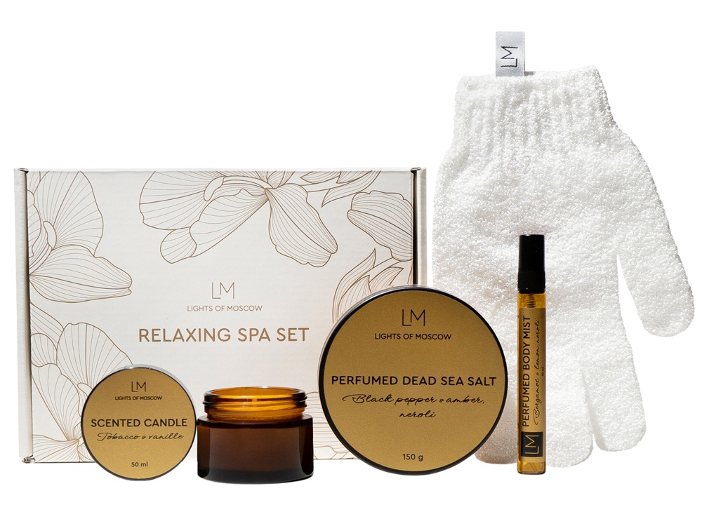Relaxing Spa Set от Lights of Moscow подарит хорошее настроение и заряд бодрости, а также послужит полезным подарком для ваших родных, близких, друзей и коллег. SPA -набор снимет стресс, поможет восстановить внутреннюю гармонию и позволит окунуться в мир ароматов селективной парфюмерии. Каждый продукт в наборе создан по мотивам современных веяний в перфорированном искусстве. Подборка из трех топовых ароматических композиций даст возможность примерить каждый парфюм на себе, почувствовать звучание и проникнуться его настроением. Комплектность: - Подарочная брендированная коробка - 1 шт. - Ароматическая свеча, 50 мл. - 1 шт. Аромат: табак и ваниль - Парфюмированный спрей для тела, 10 мл. - 1 шт. Состав: бергамот, лимон и нейроли - Парфюмированная соль для ванны, 150 мл. - 1 шт. Состав: черный перец, амбра и нероли - Перчатка для глубокого очищения - 1 шт. - Открытка - 1 шт Условия хранения: — Свечи, аромасаше, аромадиффузоры, SPA-наборы следует хранить при температуре +18…+24 °C, вдали от источников тепла, сквозняков и прямых солнечных лучей. — Рекомендуемая влажность — не более 50%. — Избегайте длительного воздействия яркого света.