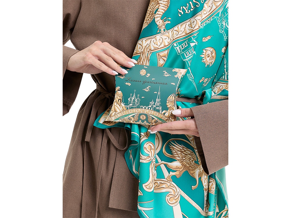 Казань – столица Республики Татарстан, третья столица Российской Федерации, один из крупнейших религиозных, экономических,образовательных, культурных и спортивных центров России. Казань-это город с богатой, многовековой историей, многообразие его культурного наследия привлекает туристов со всего мира! Столицу Татарстана традиционно называют мультикультурной, здесь бок о бок соседствуют мечеть и православный храм, прослеживается смешение религии, ментальности и истории Востока и Запада. В центре композиции раскинулся величественный ансамбль легендарного Казанского Кремля, объект Всемирного наследия ЮНЕСКО, в составе которого отчетливо просматривается Мечеть Кул-Шариф, Благовещенский Собор и Башня Сююмбике. Панорама заключена в золотую рамку с татарским национальным узором, по углам которой мы видим образы любимой царицы казанских татар — Сююмбике и собирательный образ казанского Хана – символа доблести, отваги и мужества. Немаловажное место в общем решении платка занимает Коронованный дракон Зилант— официальный символ, изображенный на гербе города Казани. Крылатый барс как — Бог плодородия и покровитель детей, изображение которого присутствует на государственном гербе Республики Татарстан идеально вписывается в общую композицию. На платке барс изображен в виде золотой скульптуры, как и Зилант, это придает платку сказочности, волшебства и царственности. Над дизайном работали художники: Нина Ручкина, Александра Гринева.