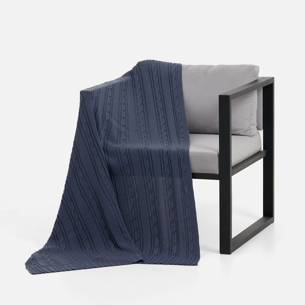 Тонкое переплетение вертикальных кос-жгутов создает благородную фактуру, где простота линий встречается с изысканной текстурой. Плед из мягкого акрила сохраняет тепло, оставаясь удивительно легким и воздушным.