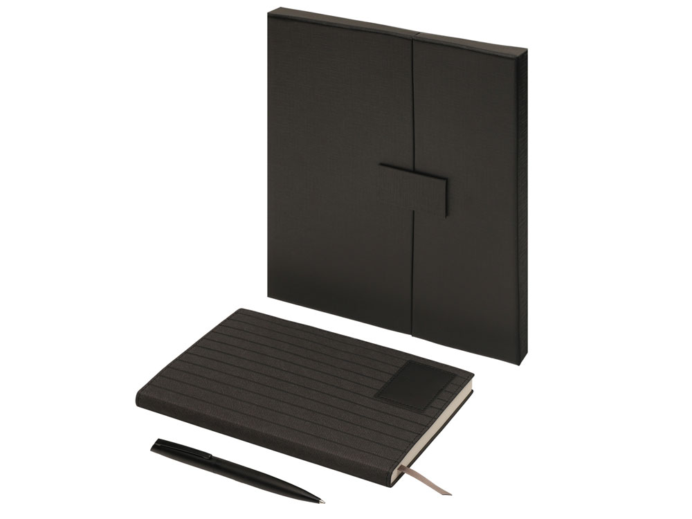 Bradbury & Co - это элегантный подарочный набор, упакованный в красивую коробку на магните. Внутри — блокнот в обложке из рифленой экокожи и металлическая шариковая ручка. Ручка гармонирует с блокнотом за счет рифленой нижней части, а блокнот имеет специальный патч для нанесения логотипа (который можно также нанести на более ровную поверхность на обороте блокнота) и ляссе-закладку для удобства. При гравировке на ручке вскрывается эффектный серебристый цвет. Внутри блокнота - 80 листов кремовой бумаги 80 г/м2 с FSC-сертификатом ответственного лесопользования. Стержень ручки заправлен синими немецкими чернилами Dokumental и швейцарским пишущим узлом Premec, что обеспечивает мягкость и плавность письма.