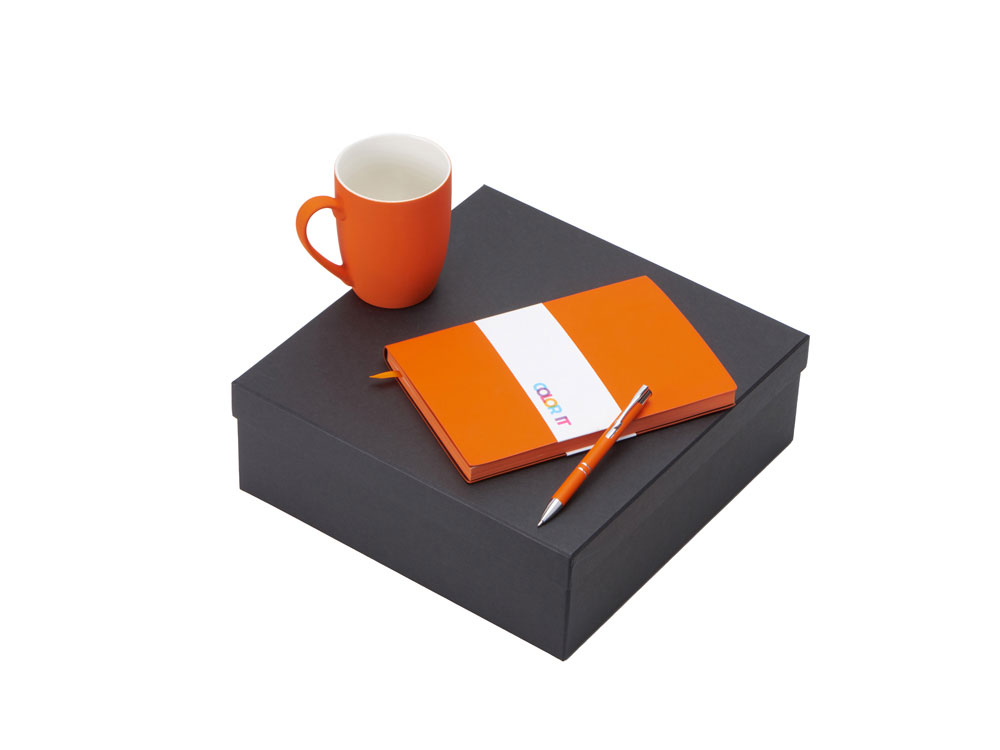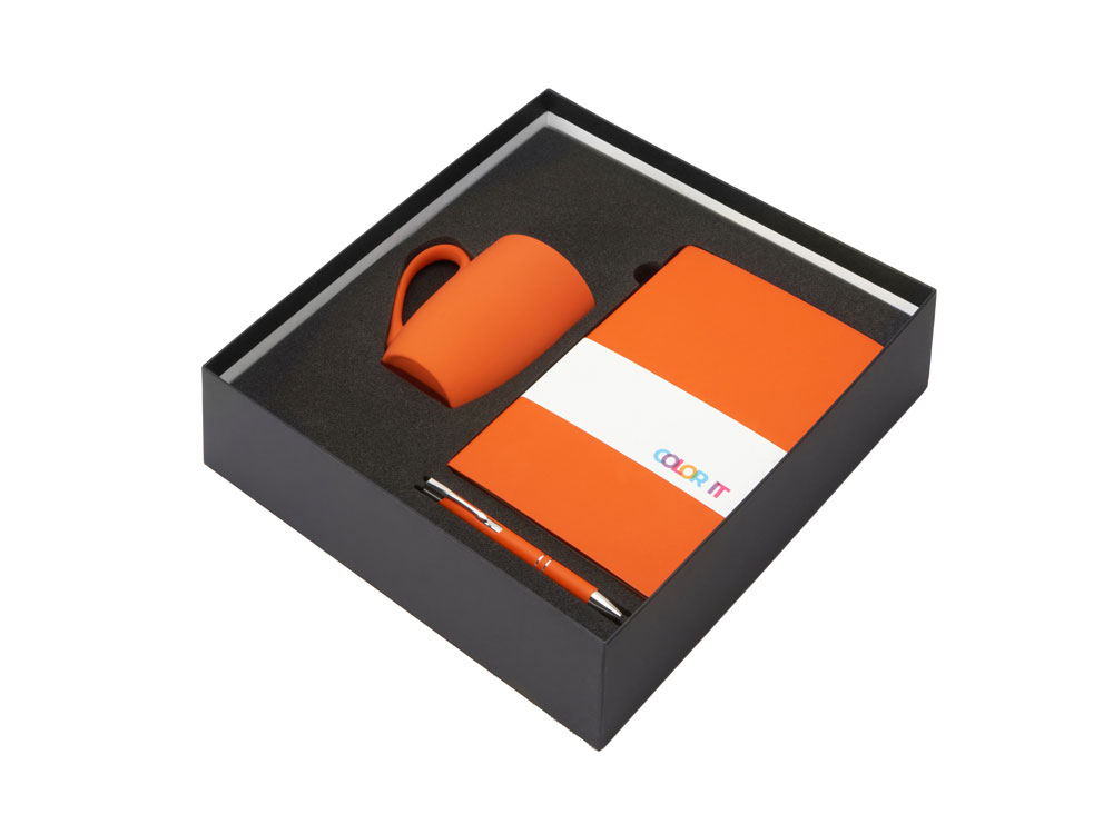 Color It — линейка, в которую входят хиты мерча в десяти самых популярных цветах. Еще никогда собрать сет под свой брендбук не было так просто. Широкая цветовая палитра серии позволяет создать идеальный набор в едином оттенке Pantone. Все товары имеют тактильно приятное покрытие софт-тач. Сет поставляется в коробке: мы продумали все, включая подарочную упаковку, за вас — осталось нанести лого! Фарфоровая кружка с удобной ручкой брендируется методом гравировки, поэтому нанесение будет долговечным и не сотрётся при мытье кружки. Бизнес-блокнот в твёрдой обложке имеет ляссе в тон обложки и среза. Бумажный блок разлинован в линейку и выполнен из бумаги, полученной из древесины из специальных восполняемых лесных ресурсов, имеет сертификат FSC. Шариковая ручка имеет сменный стержень, поэтому такой мерч прослужит дольше обычной одноразовой ручки, долго напоминая о вас клиентам. - объём кружки: 300 мл; - блокнот А5 128 листов; - ручка с необычным слайдером; - подарочная упаковка из картона, оклеенного дизайнерской бумагой уже включена в набор