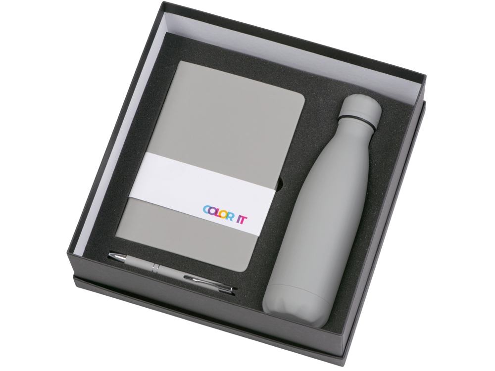 | Материал товара | блокнот - искусственная кожа с покрытием софт-тач, ручка - алюминий с покрытием софт-тач, термобутылка - нержавеющая cталь с покрытием софт-тач, коробка - картон |
