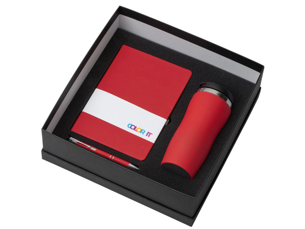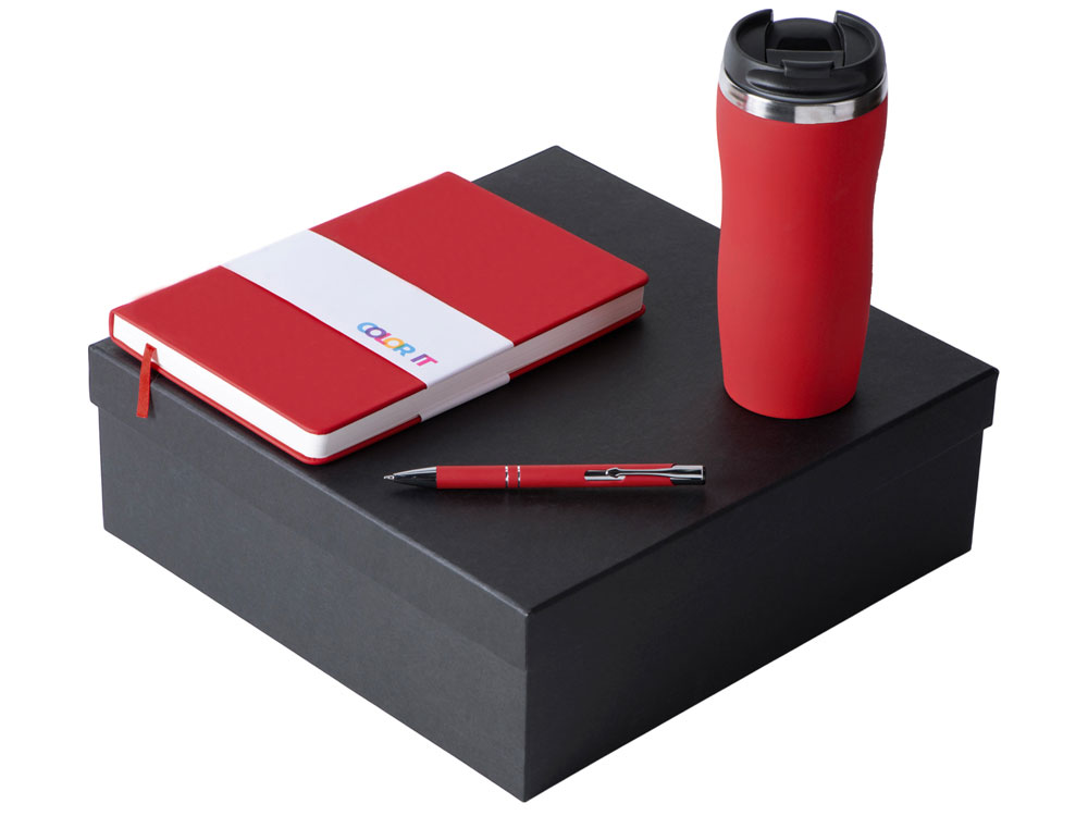 Color It — линейка, в которую входят хиты мерча в десяти самых популярных цветах. Еще никогда собрать сет под свой брендбук не было так просто. Широкая цветовая палитра серии позволяет создать идеальный набор в едином оттенке Pantone. Все товары имеют тактильно приятное покрытие софт-тач. Сет поставляется в коробке: мы продумали все, включая подарочную упаковку, за вас — осталось нанести лого! Термокружка оснащена плотно завинчивающейся крышкой, которая исключает проливание содержимого. Откидной клапан позволяет пить, не снимая крышку. Сохранение температуры осуществляется благодаря вакуумной изоляции и двойным стенкам. Бизнес-блокнот в твёрдой обложке имеет ляссе в тон обложки. Бумажный блок разлинован в линейку и выполнен из бумаги, полученной из древесины из специальных восполняемых лесных ресурсов, имеет сертификат FSC. Шариковая ручка имеет сменный стержень, поэтому такой мерч прослужит дольше обычной одноразовой ручки, долго напоминая о вас клиентам. - софт-тач покрытие на всех предметах набора; - объём термокружки: 350 мл; - блокнот А5 128 листов; - ручка с необычным слайдером; - подарочная упаковка из картона, оклеенного дизайнерской бумагой уже включена в набор.