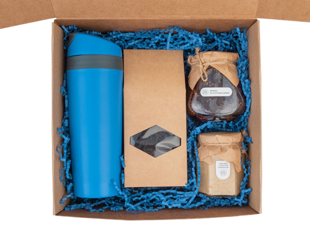 Материал товара коробка - картон, банка - стекло, термокружка - полипропилен
