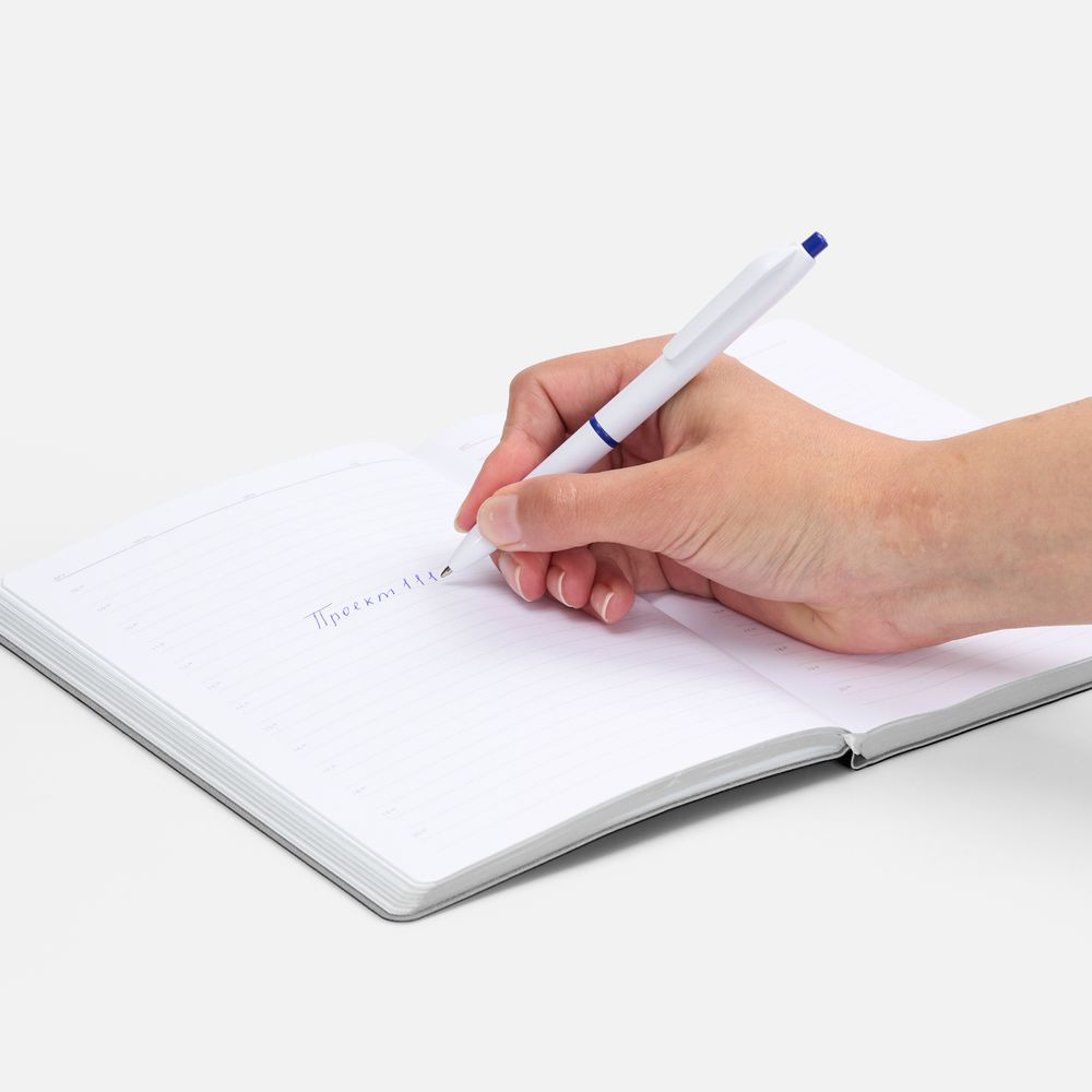 Классическая модель ручки с акцентными деталями: кольцом и кнопкой, — которые дополнят логотип компании.