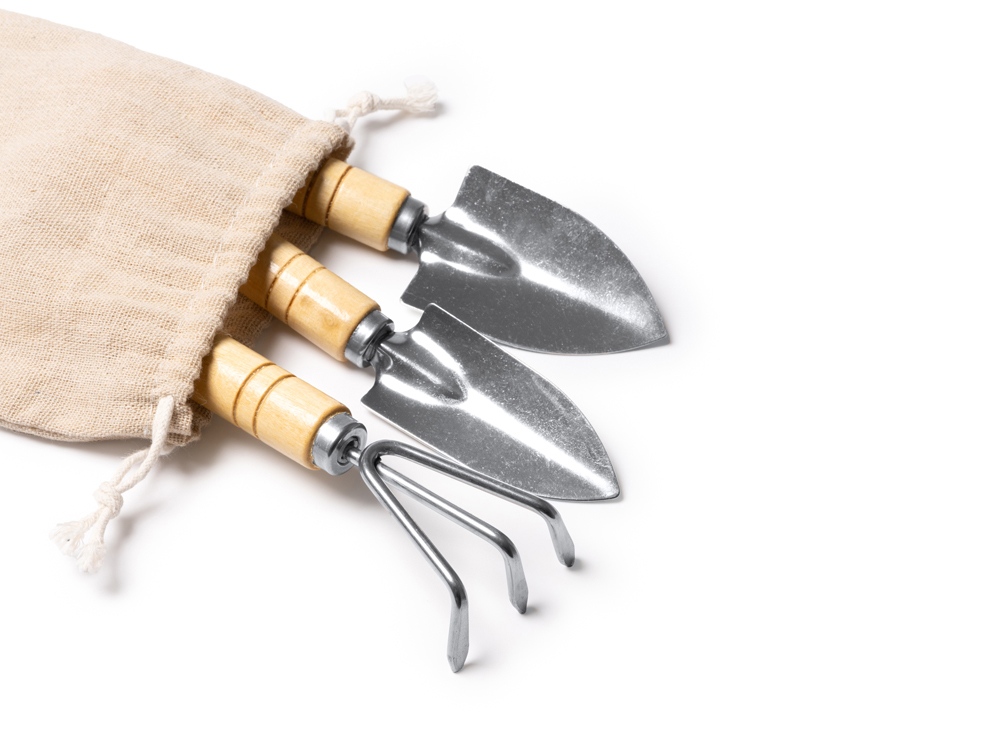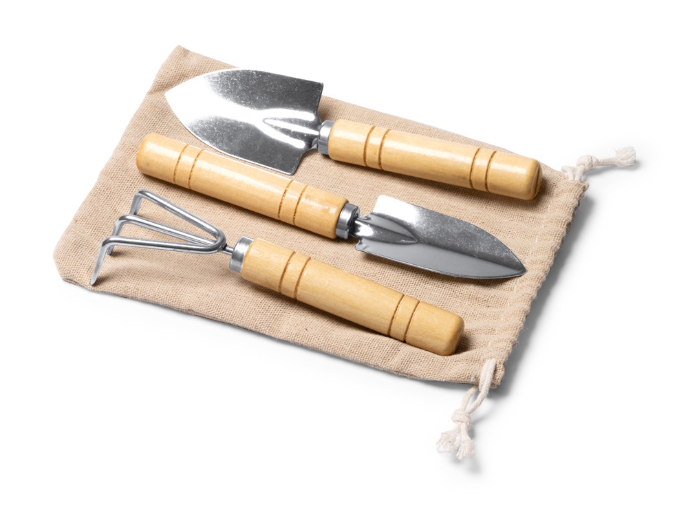 Садовый набор из 3 аксессуаров из нержавеющей стали с бамбуковыми ручками. Включает большую и малую лопатки и грабли. В комплект входит хлопковый мешочек.
