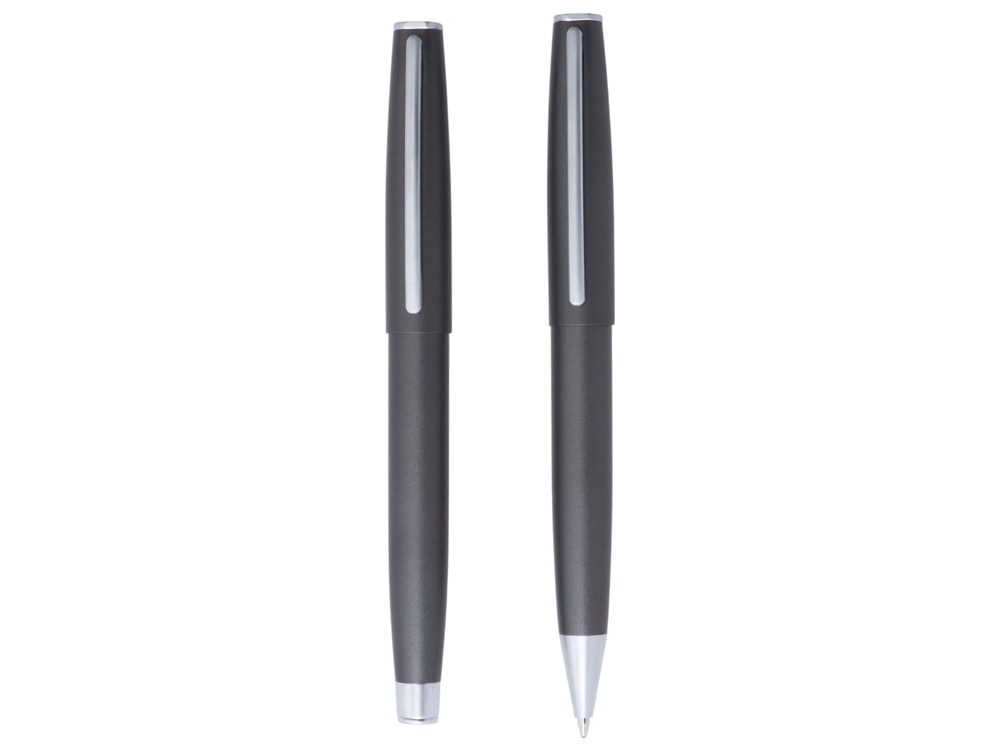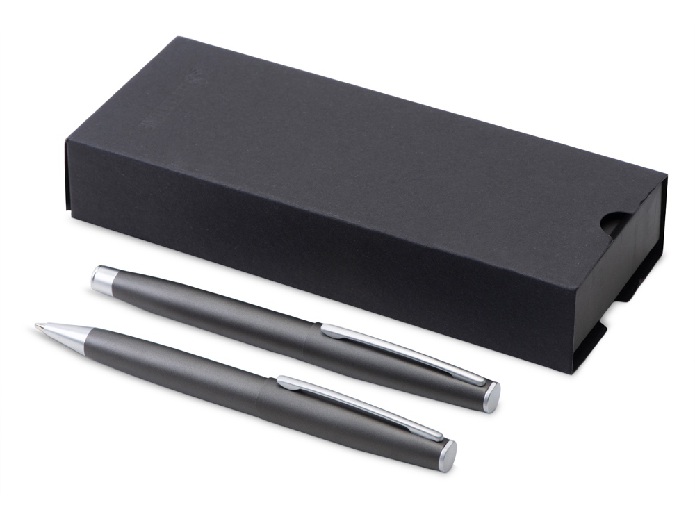 Статусный и функциональный набор состоит из двух металлических ручек - шариковой и роллера. Широкая форма помогает ручкам комфортно ложиться в руку и увеличивает площадь для нанесения логотипа. Швейцарский пишущий узел Premec и немецкие чернила Dokumental обеспечивают мягкое и плавное письмо. Ручки упакованы в классический чёрный матовый футляр с логотипом бренда Lettertone на дне. - набор в подарочной упаковке; - цвет чернил: синий; - идеальный вариант под гравировку.
