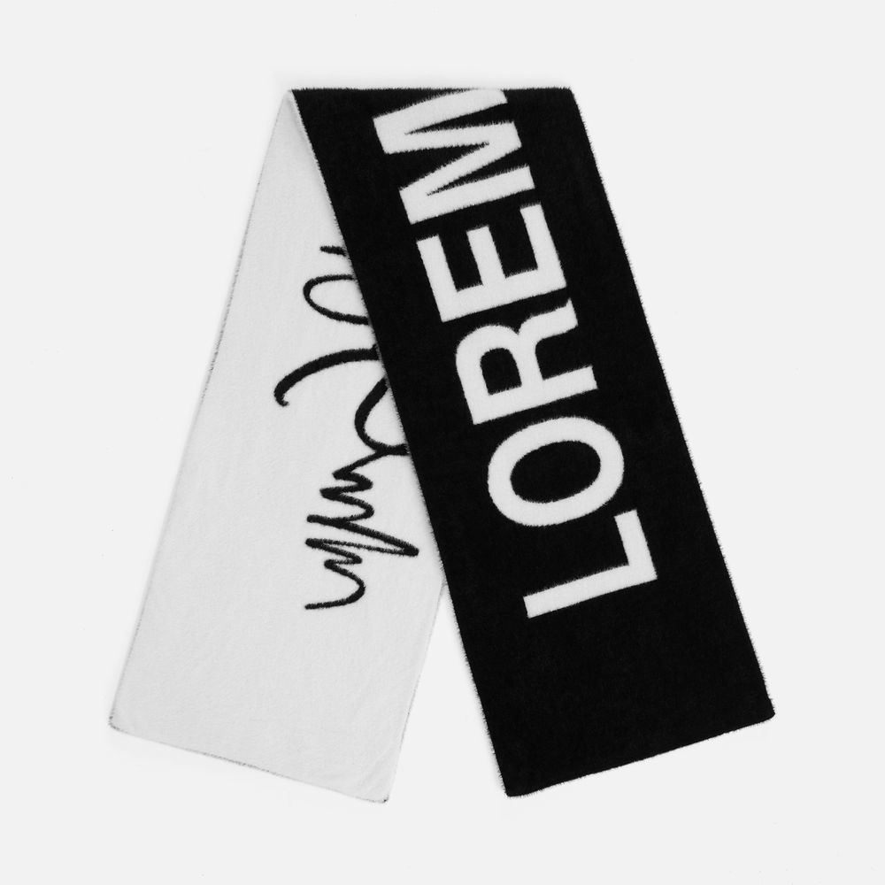 Шарф из пушистого нейлога с вывязанным логотипом и индивидуальным рисунком в черно-белой гамме.