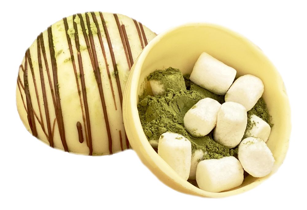 Состав: сфера из белого шоколада, чай матча, маршмеллоу.