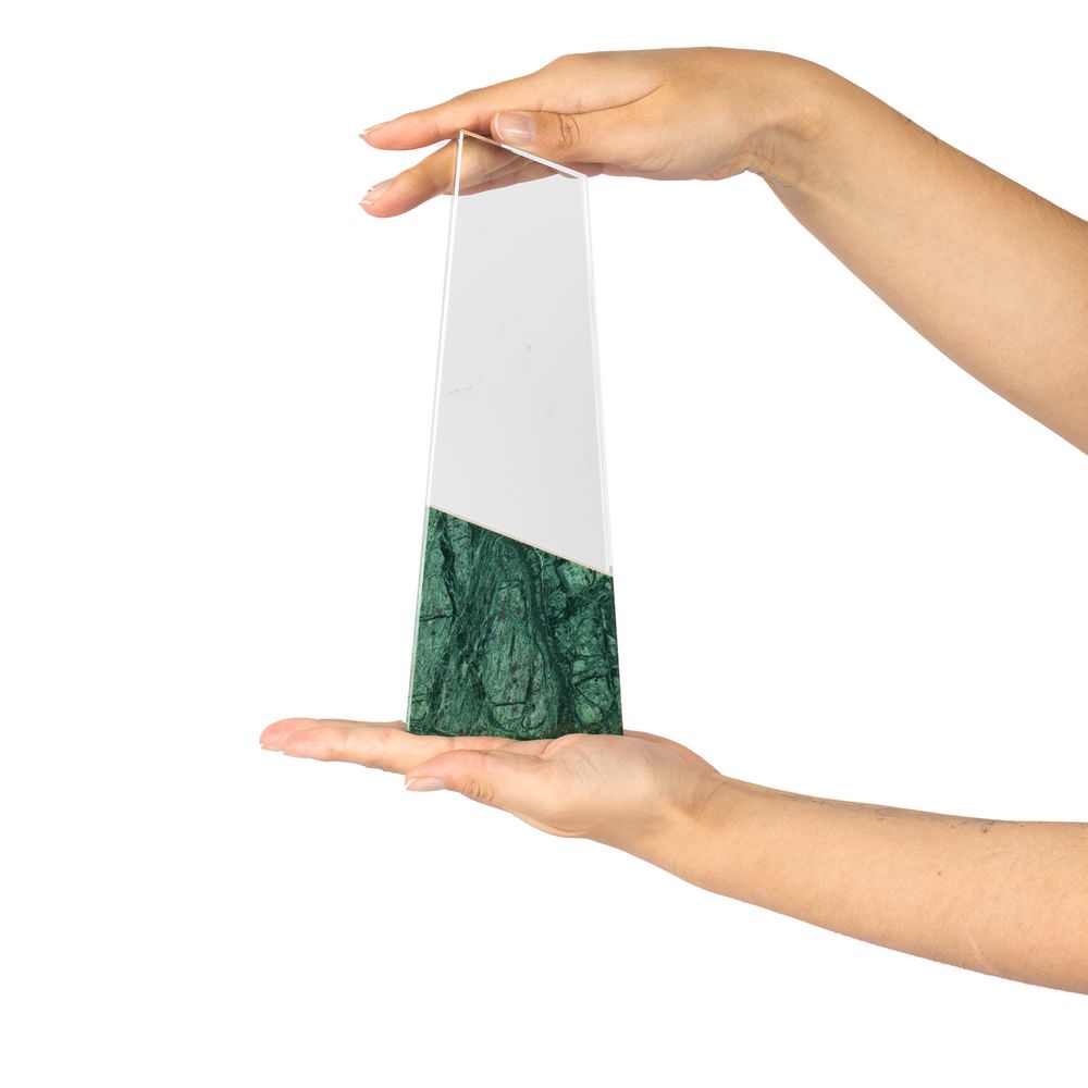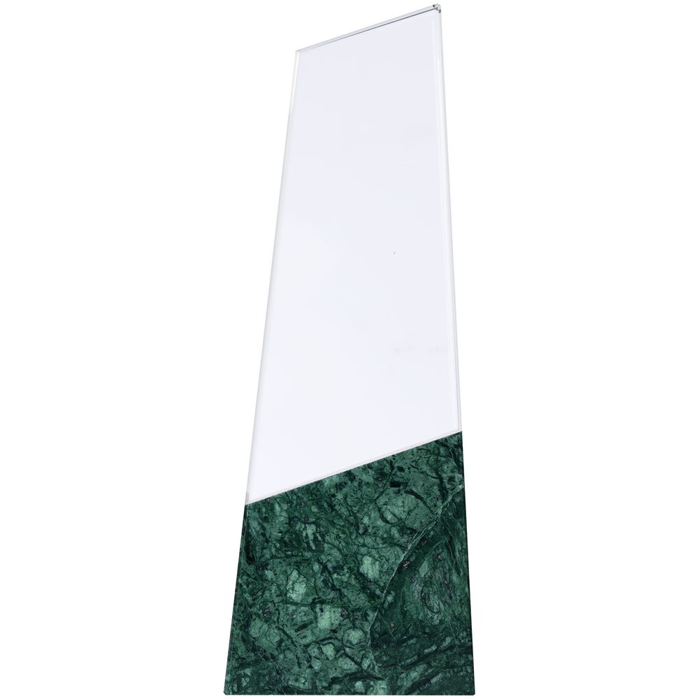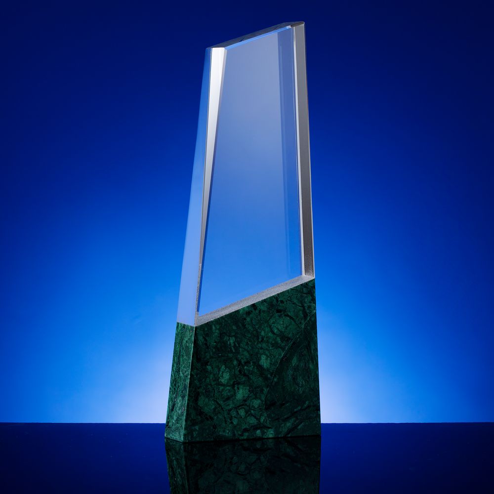 На основании из серпентина закреплен блок из стекла К9, в основе которого лежит оптическое боросиликатное стекло. Эту марку стекла отличает низкий процент посторонних включений, высокий показатель преломления и высокая прозрачность — идеальные качества для изготовления наград премиального уровня.