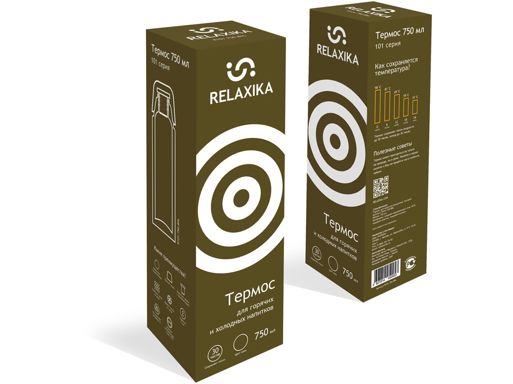 Классический термос Relaxika с высокими показателями удержания температуры напитка для походов, путешествий, спорта и ежедневного использования. Прочные двойные стенки из высококачественной нержавеющей стали 18/8 с вакуумной изоляцией гарантируют, что ваш напиток останется холодным в течение 36 часов и горячим до 30 часов. Этот материал не только прочен, но и гигиеничен, не выделяет никаких вредных для здоровья веществ. Ваши напитки сохраняет естественный вкус и не приобретут посторонний запах. Напиток остается холодным до 36 часов и горячим до 30 часов. - Узкое горлышко позволяет удерживать температуру максимально долго - Крышку термоса можно использовать как чашку BPA Free. В пластмассах, используемых для производства термосов, отсутствует Бисфенол А - Надежная закручивающаяся пробка с силиконовым кольцом защищает от протекания и помогает удерживать температура - Высококачественная нержавеющая сталь 18/8 Рекомендации по уходу Не рекомендуется использовать посудомоечные машины при мытье изделия. Мойте мягкими губками и жидкими моющими средствами. Не используйте сухие абразивные средства чтобы не поцарапать поверхность. После мытья необходимо протереть сухой салфеткой или полотенцем и оставить сушиться без крышки. Не для микроволновой печи или морозильной камеры. Чтобы предотвратить утечку, тщательно закройте верхнюю крышку.