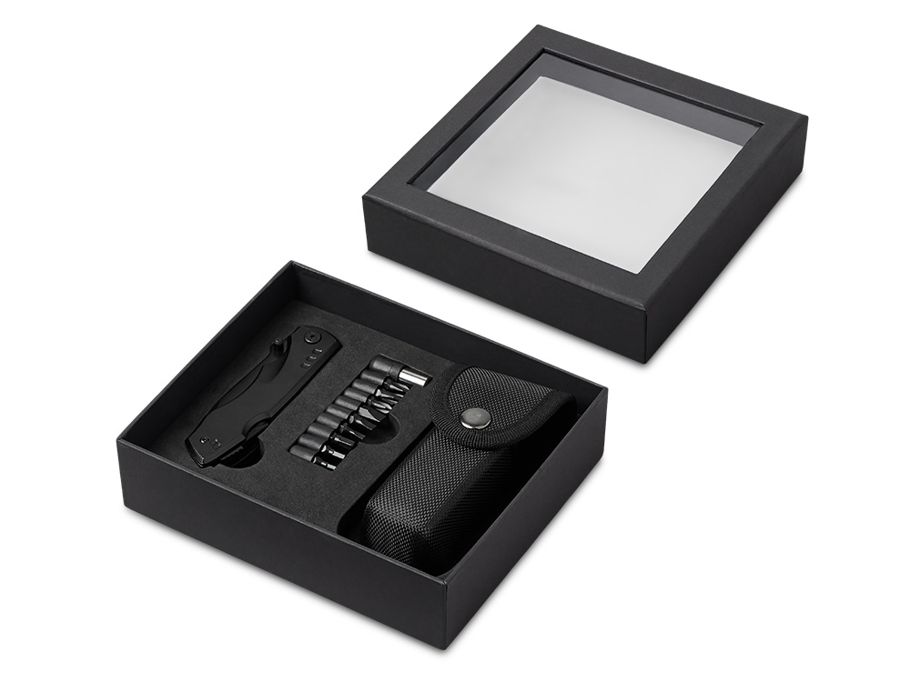 Мультитул, который меняет представление о корпоративных сувенирах. Шэйп — это универсальный инструмент с 18 функциями, который не отложат на полку. Компактный, функциональный и эффектно упакованный, он становится ежедневным приятным напоминанием о вашей компании или бренде. • Максимум пользы в минимуме места: большие пассатижи, средний нож, набор бит и другие полезные инструменты • Стильный дизайн и функционал дополняют друг друга • Готовое решение под бренд: цифровая печать на окне упаковки или гравировка на мультитуле • Премиальная комплектация: текстурированный чехол для мультитула и бит в комплекте • Надежный материал: нержавеющая сталь гарантирует долгий срок службы Список всех функций: - Пассатижи — полноразмерные губки с рифлением для надежного захвата - Кусачки — для перекусывания проволоки и кабелей - Нож — острое лезвие из нержавеющей стали - Пила — зубчатая кромка на лезвии ножа - Крестовая отвертка\основа для держателя бит — встроенная в корпус (на ручке) - Открывалка для бутылок — классический крючок - Открывалка для консервов — острый зацеп - Плоская отвертка (большая) — наконечник на корпусе - Плоская отвертка (малая) — дополнительный наконечник - Держатель для бит — крепится на отвертку 5. - Набор сменных бит (9 штук): три крестовые биты, три плоские биты, три шестигранные биты