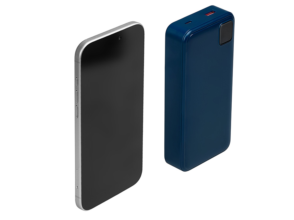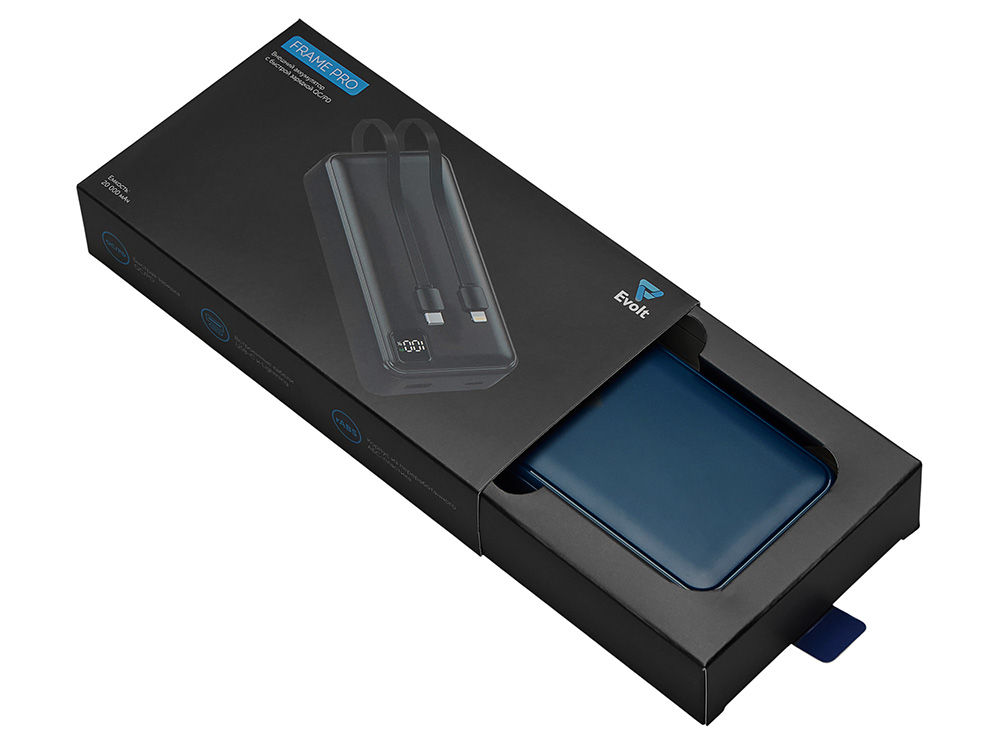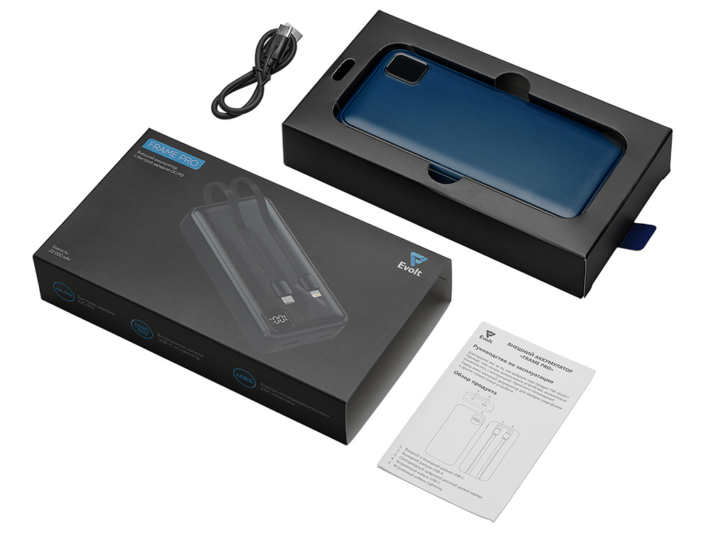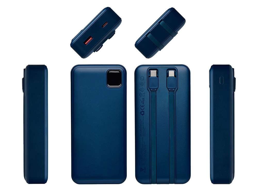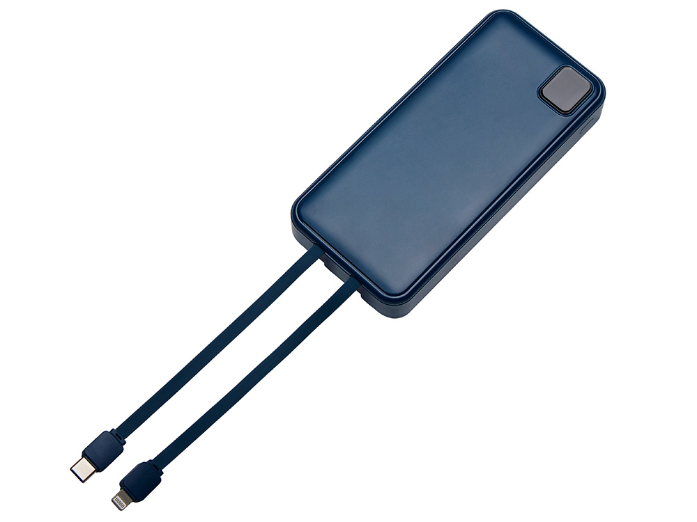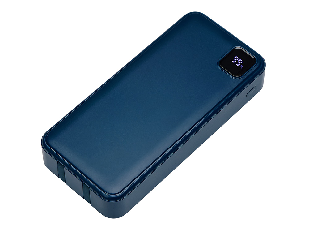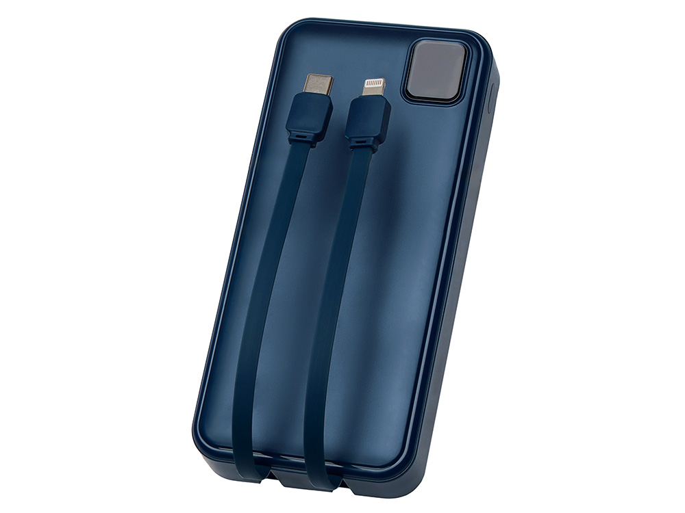 Удобный внешний аккумулятор с функцией быстрой зарядки и встроенными кабелями USB-C (симметричный разъём USB тип С) и Lightning (разъём в ранних версиях iPhone) — ваш надежный партнер в путешествиях, на встречах и в повседневных задачах. Цифровой дисплей в реальном времени показывает точный остаток заряда и статус быстрой зарядки, а встроенные кабели и несколько разъемов позволяют заряжать до 4 устройств. Прочный корпус из переработанного АБС-пластика и емкость 20000 мАч обеспечивают зарядом все ваши устройства на долгий срок. Идеальный выбор для тех, кто ценит комфорт и функциональность в одном устройстве. Продуманная упаковка: для открытия просто потяните за язычок, и появится гаджет с нанесением. - Встроенные кабели USB-C и Lightning — больше не нужно искать провода - Цифровой дисплей с точным отображением заряда - Удобная зона под нанесение логотипа - Функция быстрой зарядки, заряжает на 50% быстрее - Упаковка с удобным и быстрым открытием - До 4-5 полных зарядок смартфона