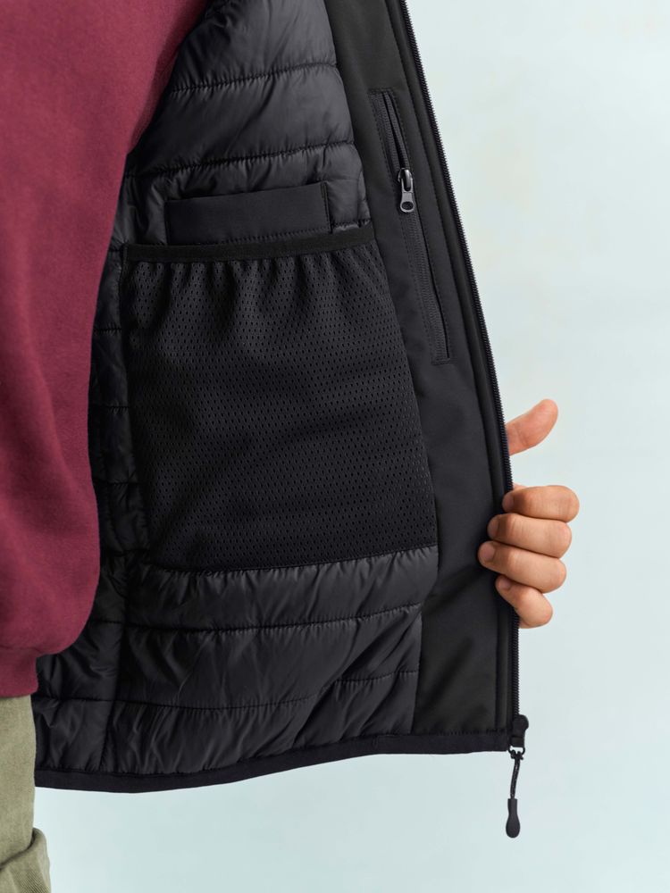 Материал верх - переработанный полиэстер, 94%; эластан 6%, плотность 270 г/м²; софтшелл; подкладка - нейлон 100%; утеплитель - переработанный полиэстер, 100%